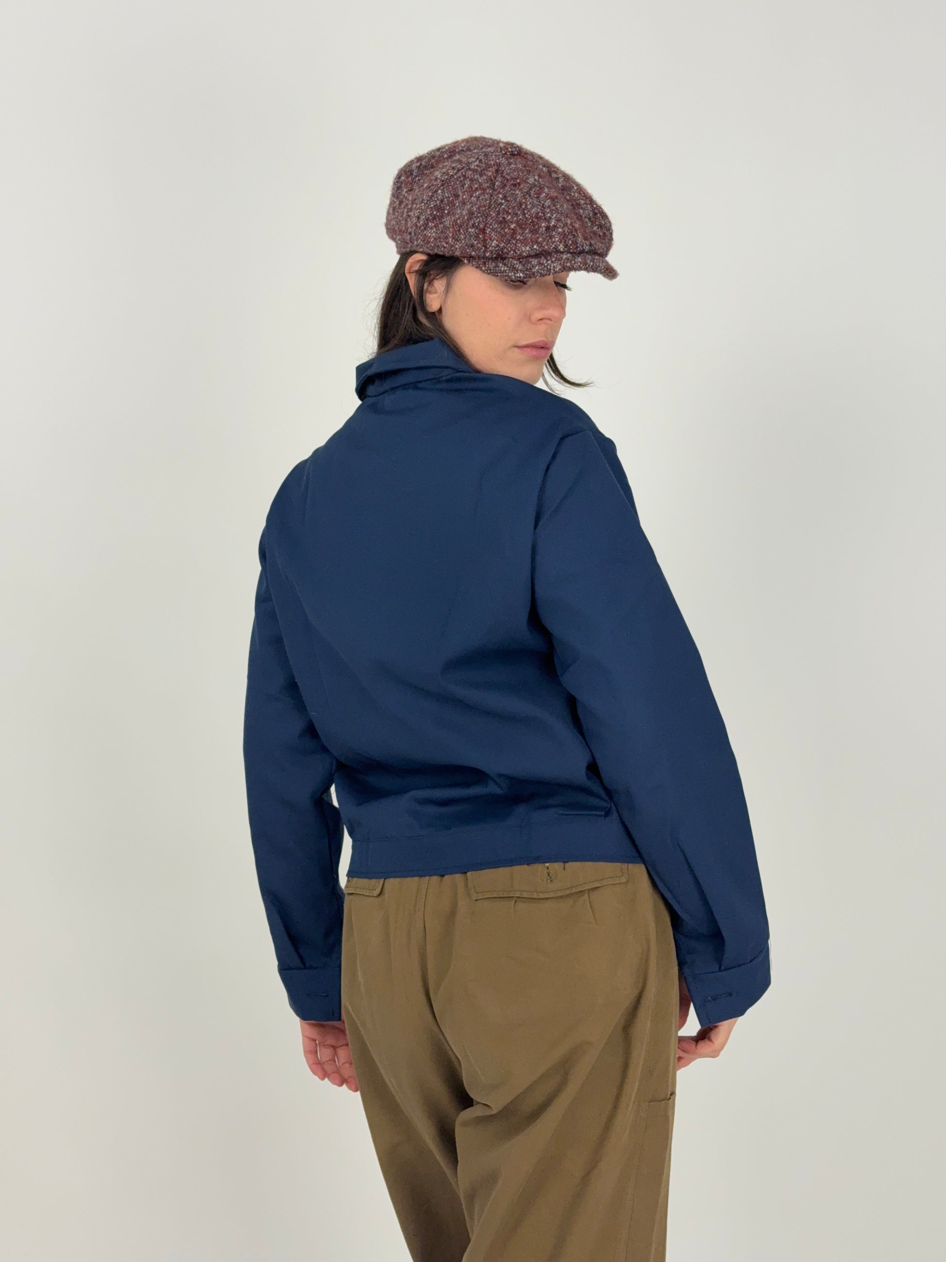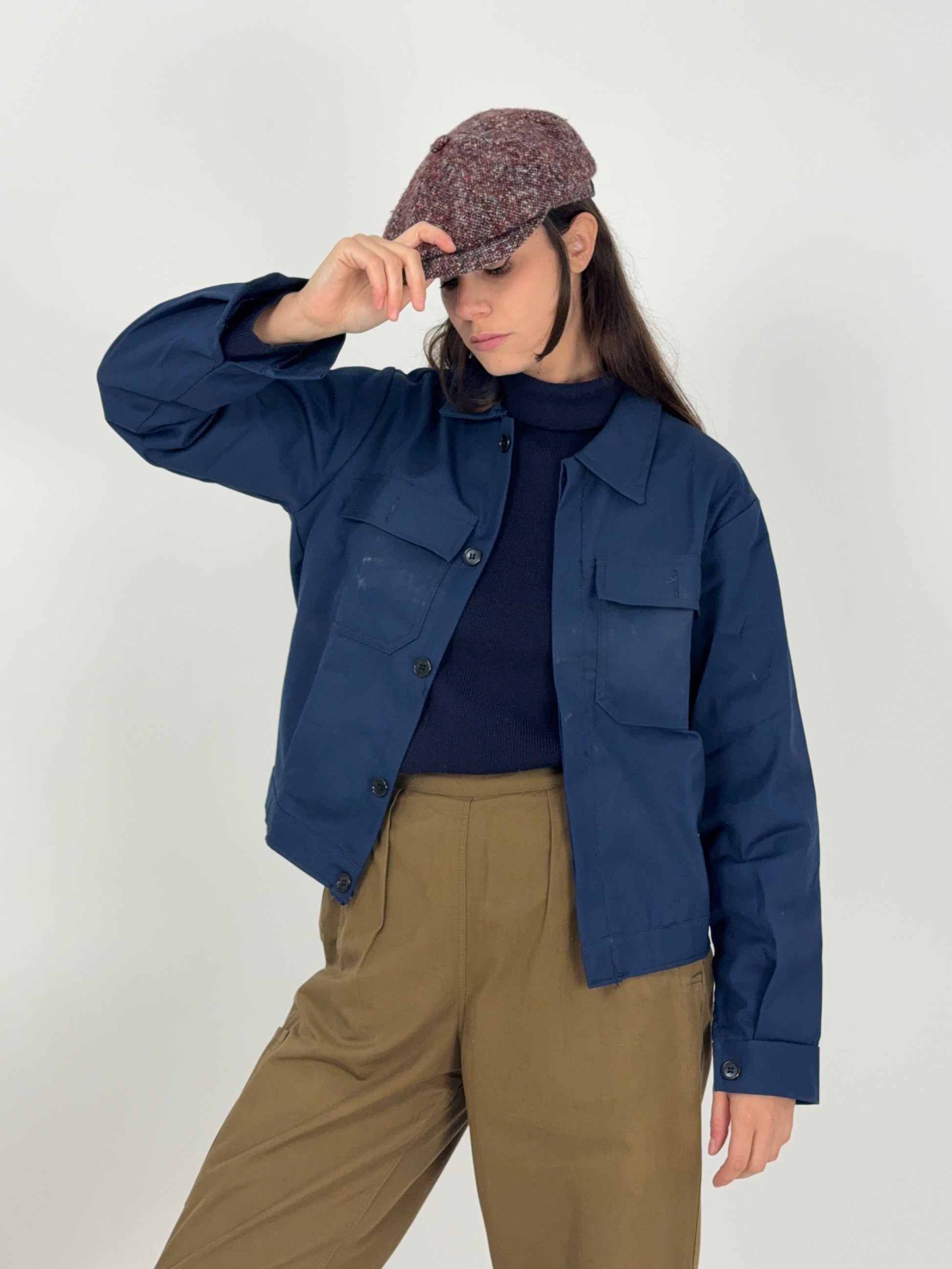 Il taglio strutturato, unito al resistente cotone blu, richiama le iconiche chore jacket francesi, reinterpretate con l’eleganza e la manifattura tipiche del Made in Italy.