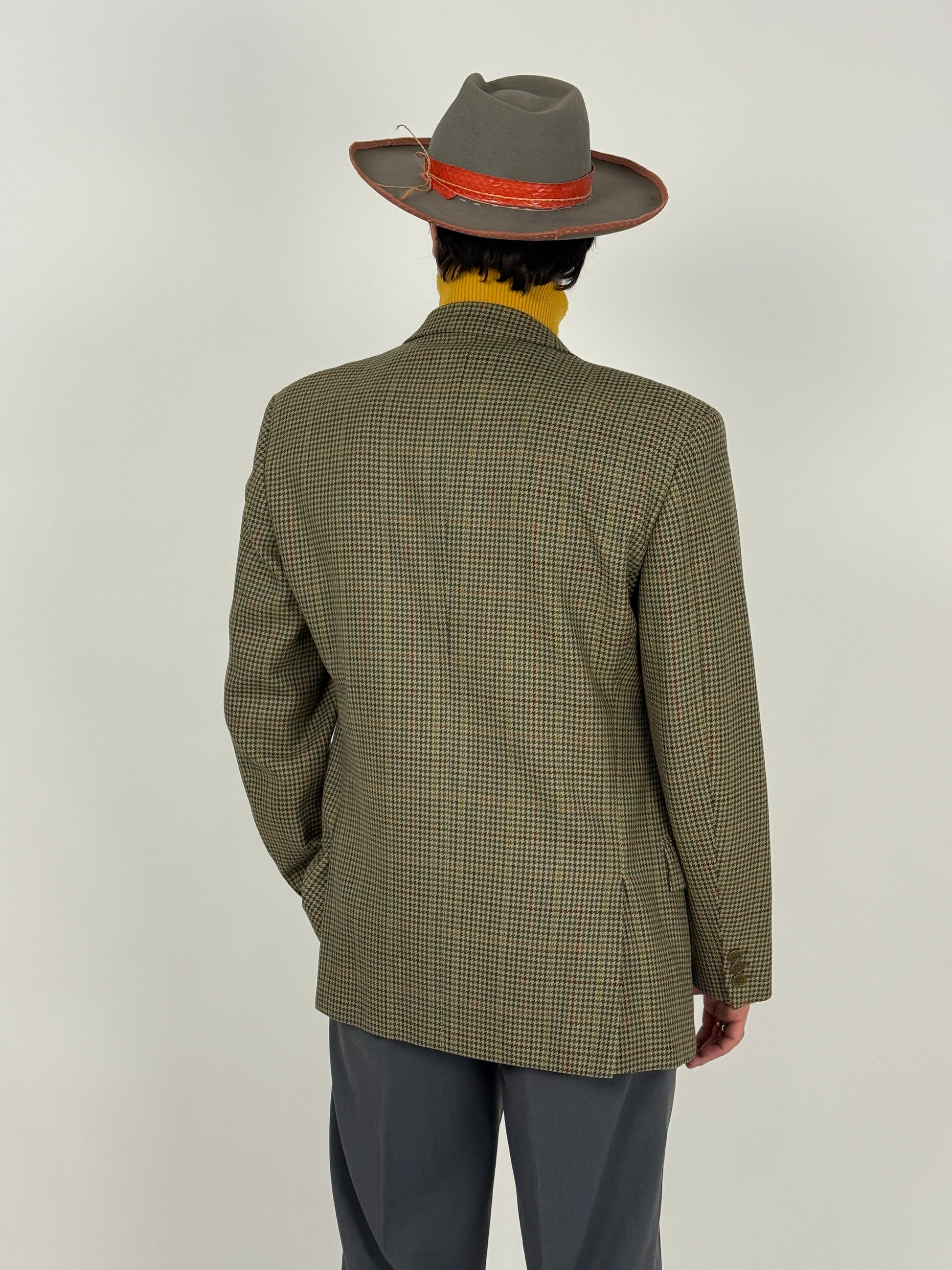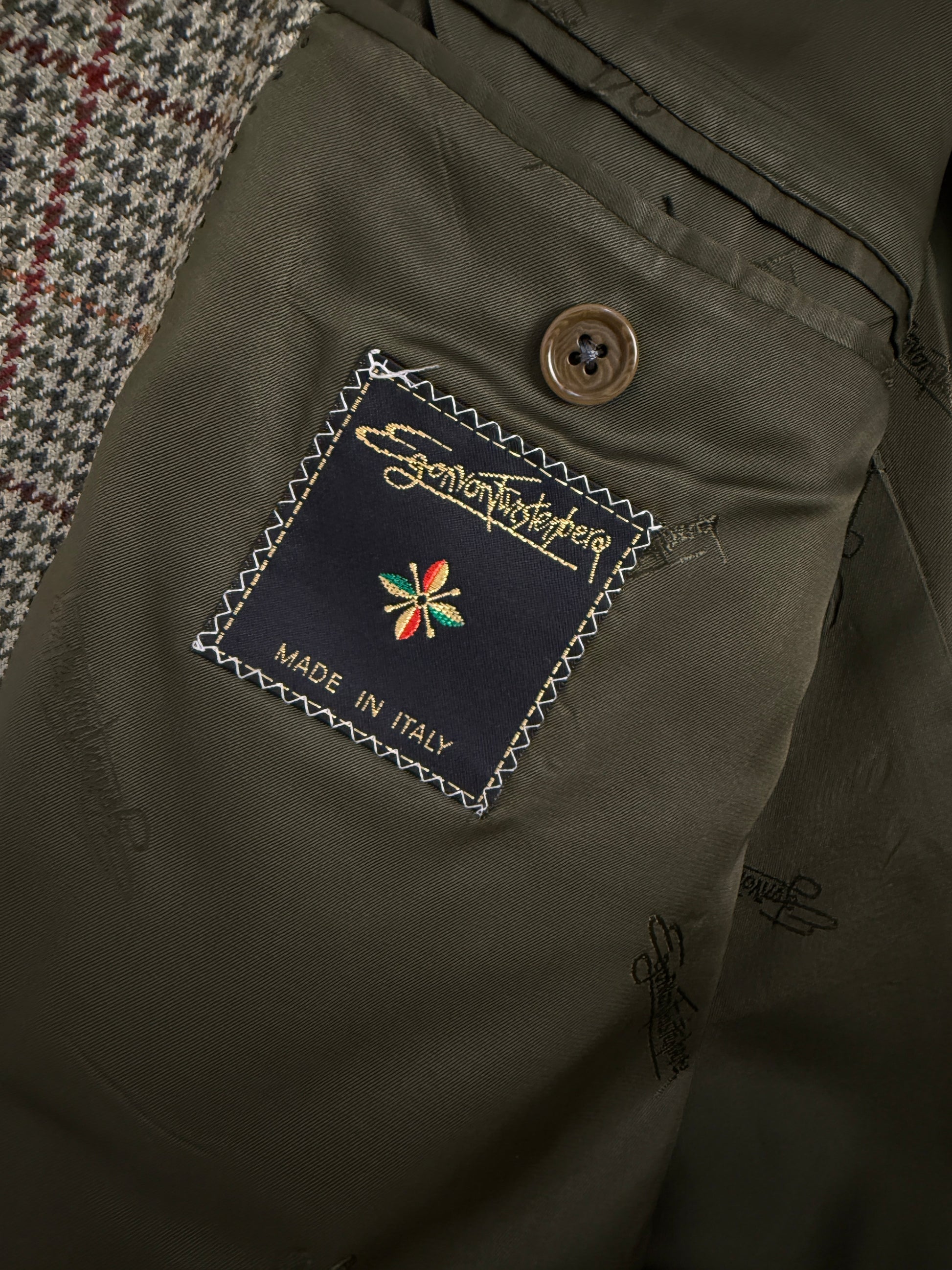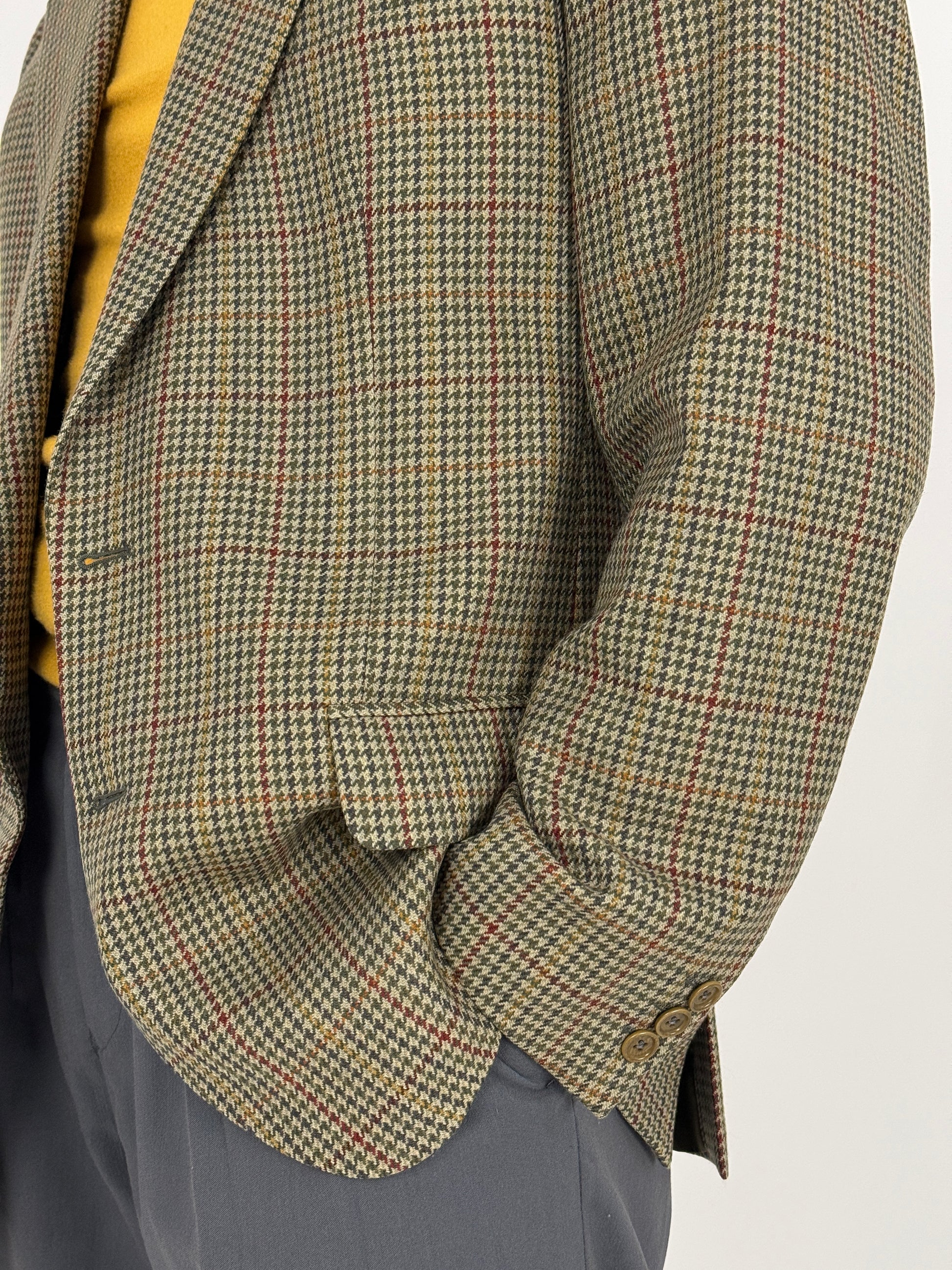 Questo modello anni ’80, Made in Italy, è realizzato in un classico pied de poule verde salvia e nero, arricchito da una finestratura rosso vino e ocra che dona subito carattere e profondità al tessuto. Una fantasia british reinterpretata con mano italiana: calda, compatta, resistente.