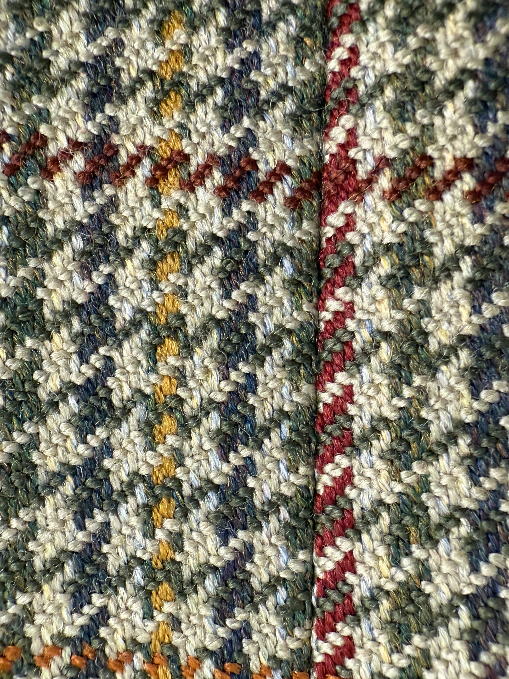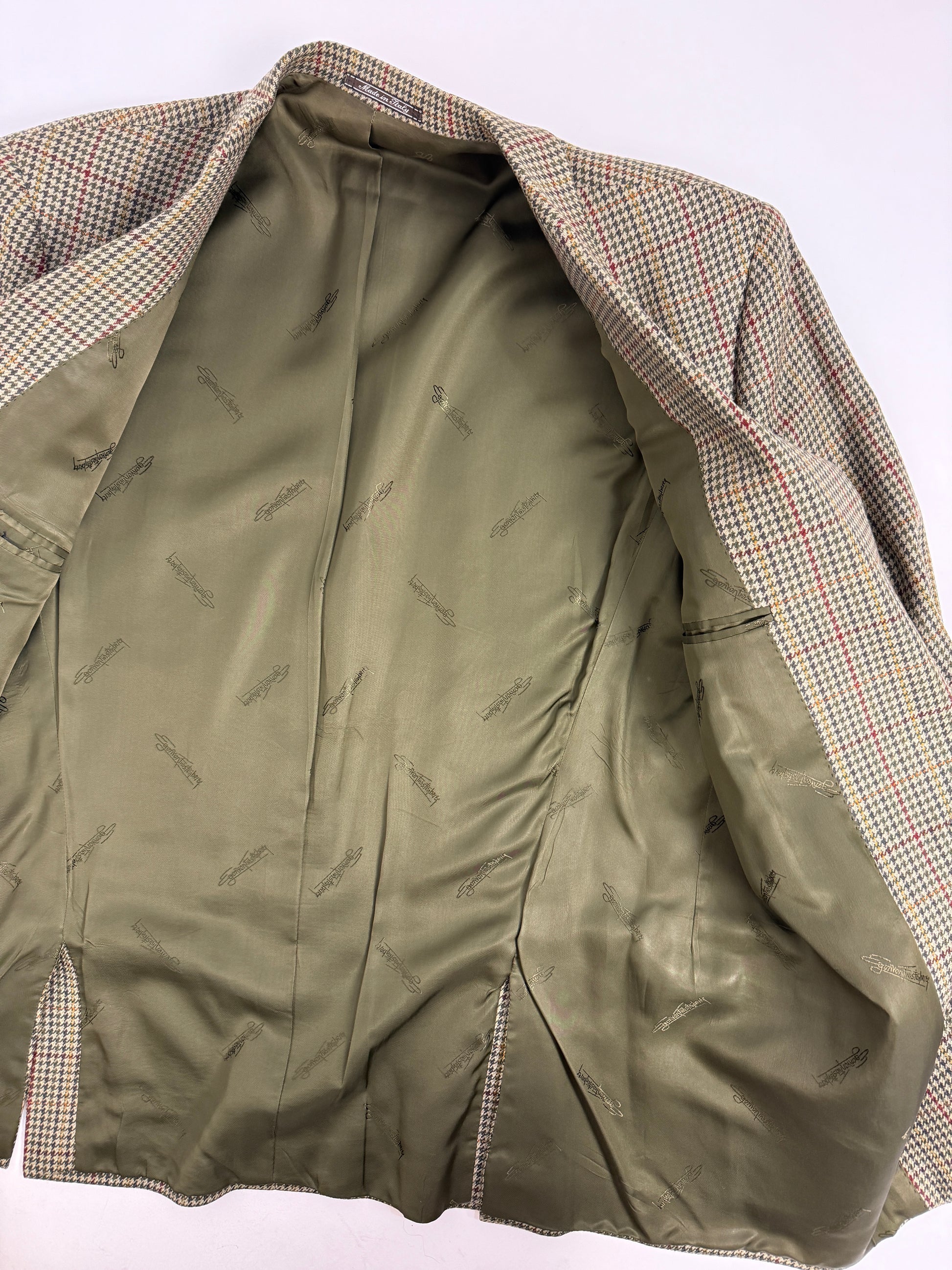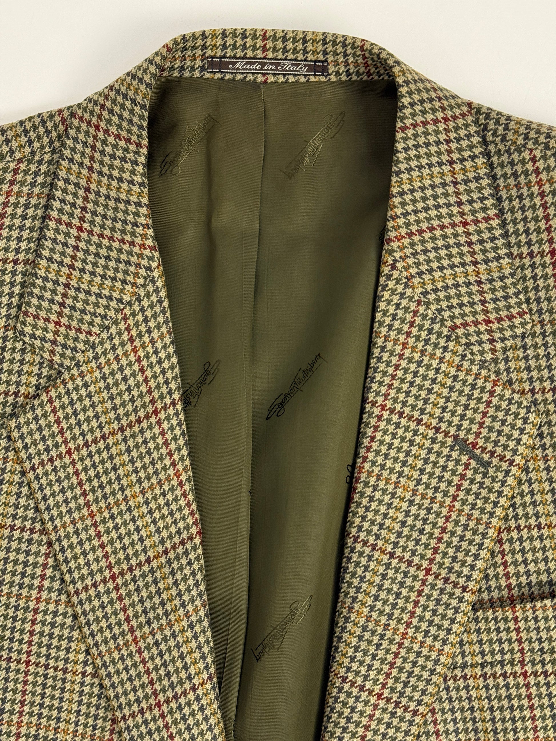 Questo modello anni ’80, Made in Italy, è realizzato in un classico pied de poule verde salvia e nero, arricchito da una finestratura rosso vino e ocra che dona subito carattere e profondità al tessuto. Una fantasia british reinterpretata con mano italiana: calda, compatta, resistente.