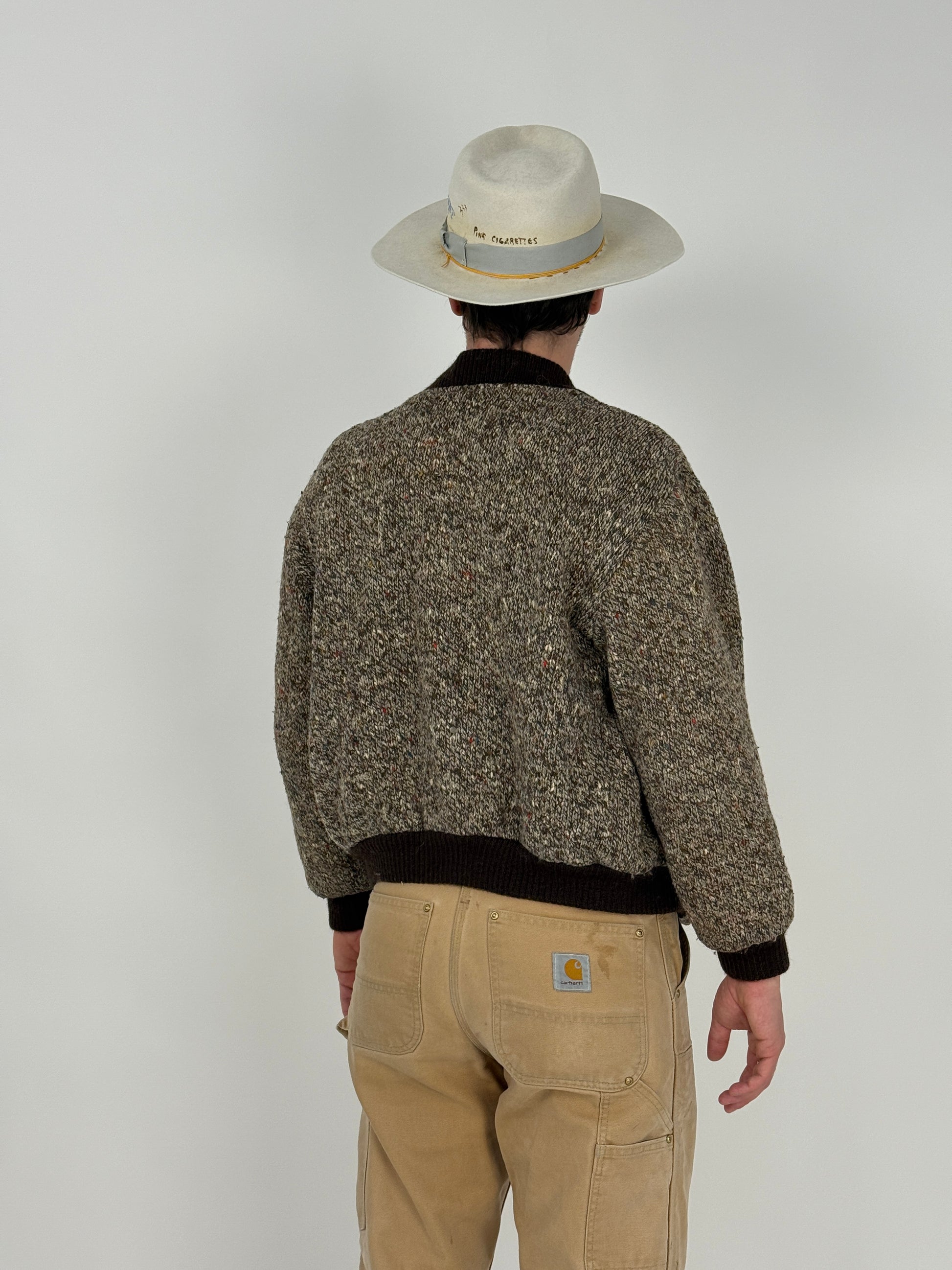 La struttura in lana tweed grossa mélange con micro-puntinature colorate e il colletto a maglia marrone le donano carattere e texture unici. L’interno è foderato in nylon lucido color tabacco, mentre il taglio corto e la zip frontale le danno una silhouette sportiva in pieno stile anni ’70.