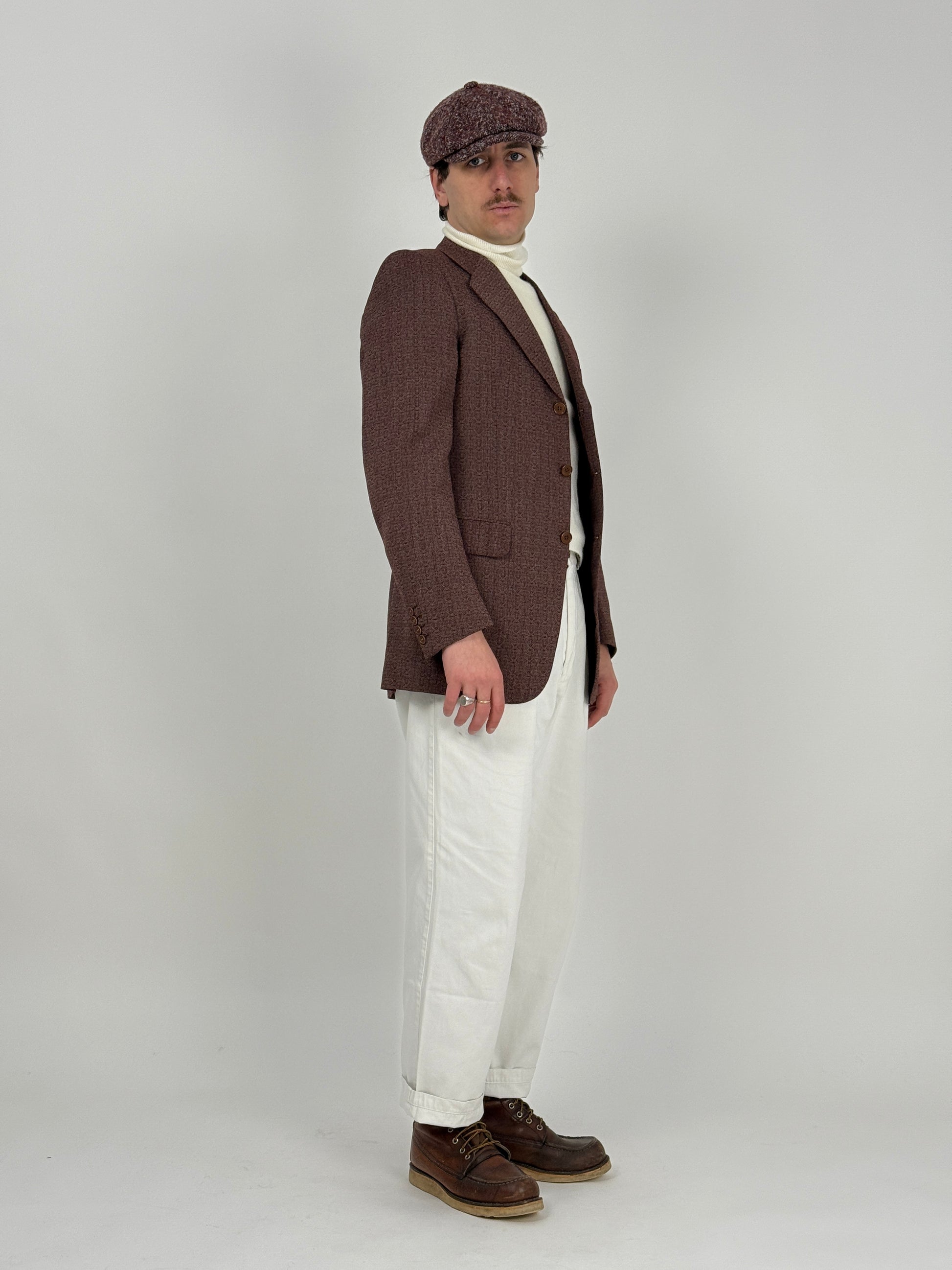 Costruzione pulita, spalle naturali e un tessuto a micro-trama geometrica marrone che vive di sfumature. I bottoni tono su tono, il rever dalla linea morbida e la lunghezza leggermente estesa completano un’estetica senza tempo, perfetta sia con denim chiaro che con pantaloni sartoriali.