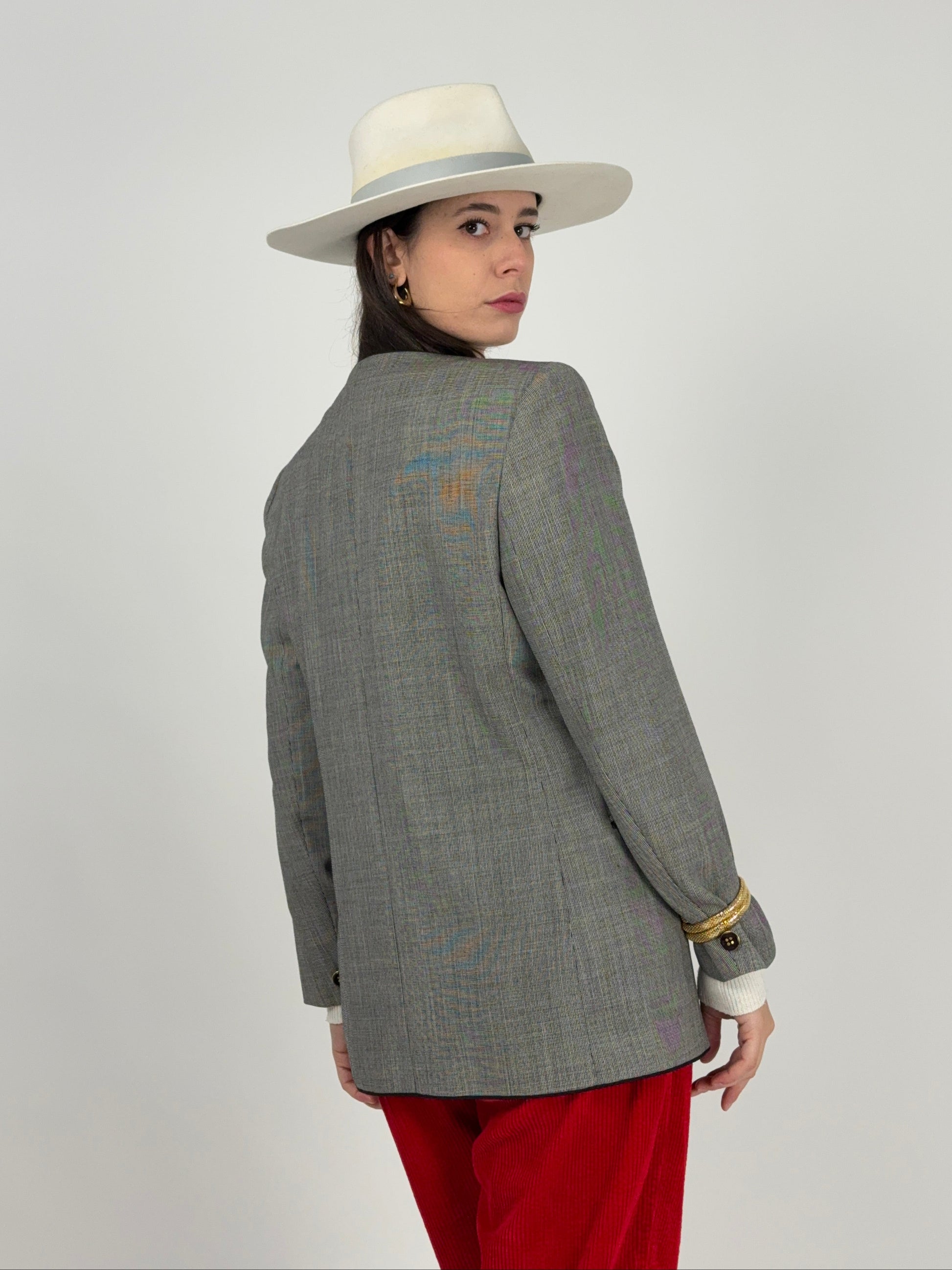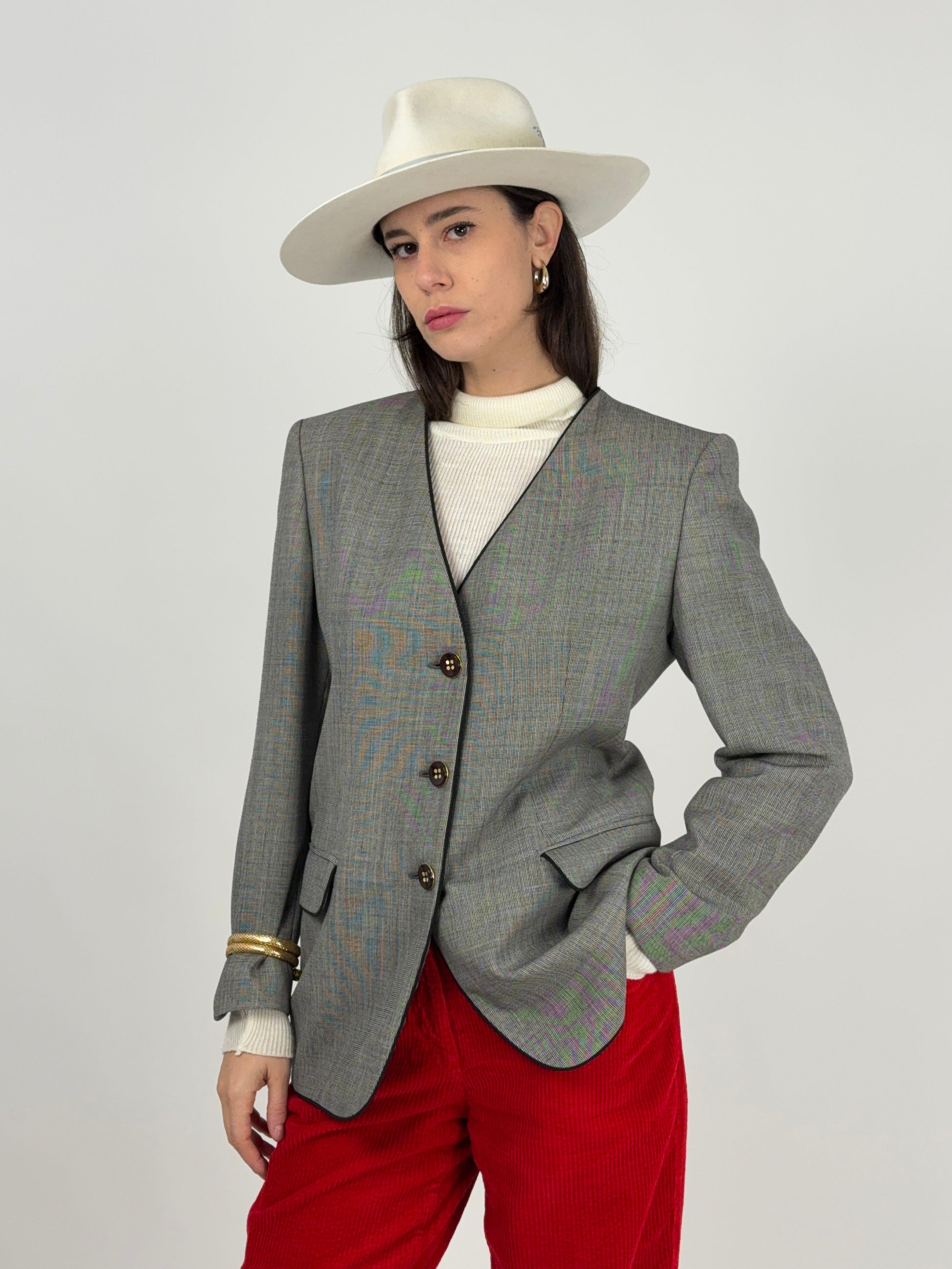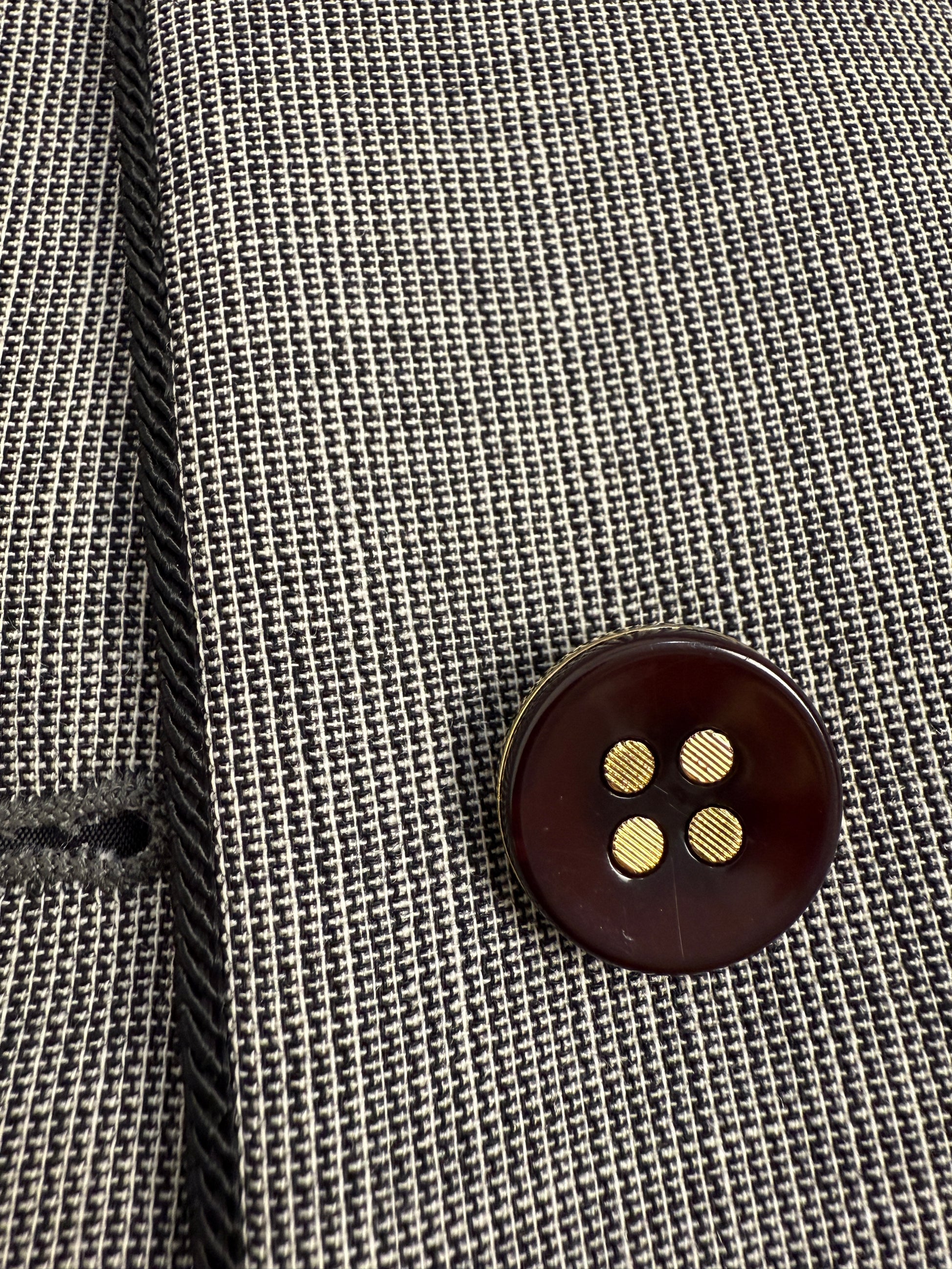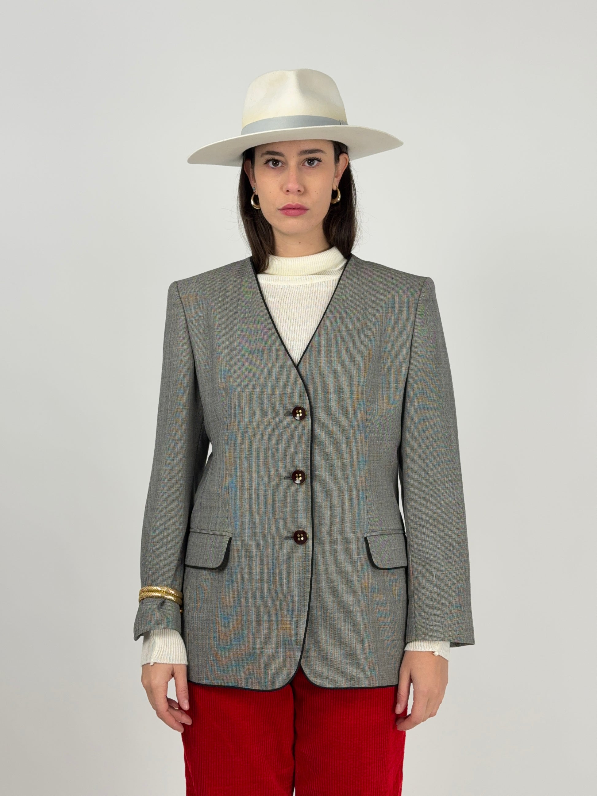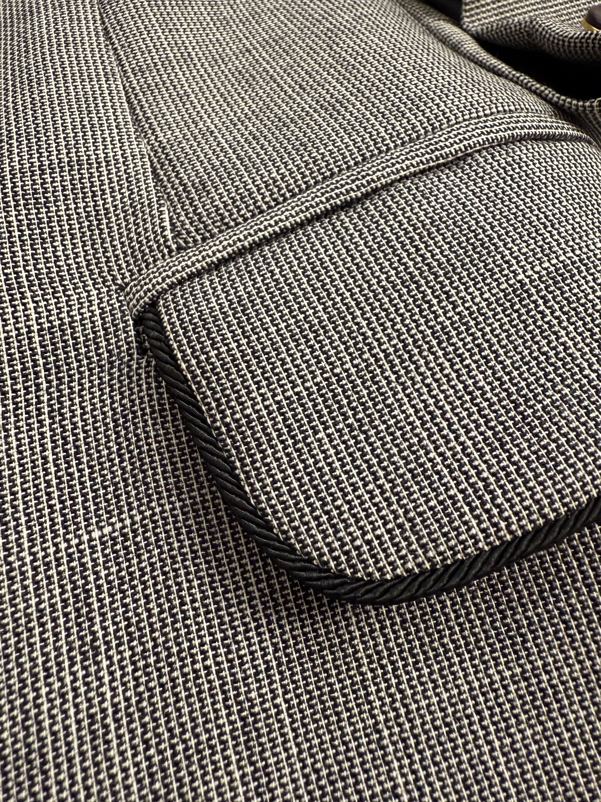 Il modello presenta un motivo micro-check grigio/nero, rifinito da profili neri e bottoni. La silhouette è dritta e pulita, con linea elegante e struttura solida.