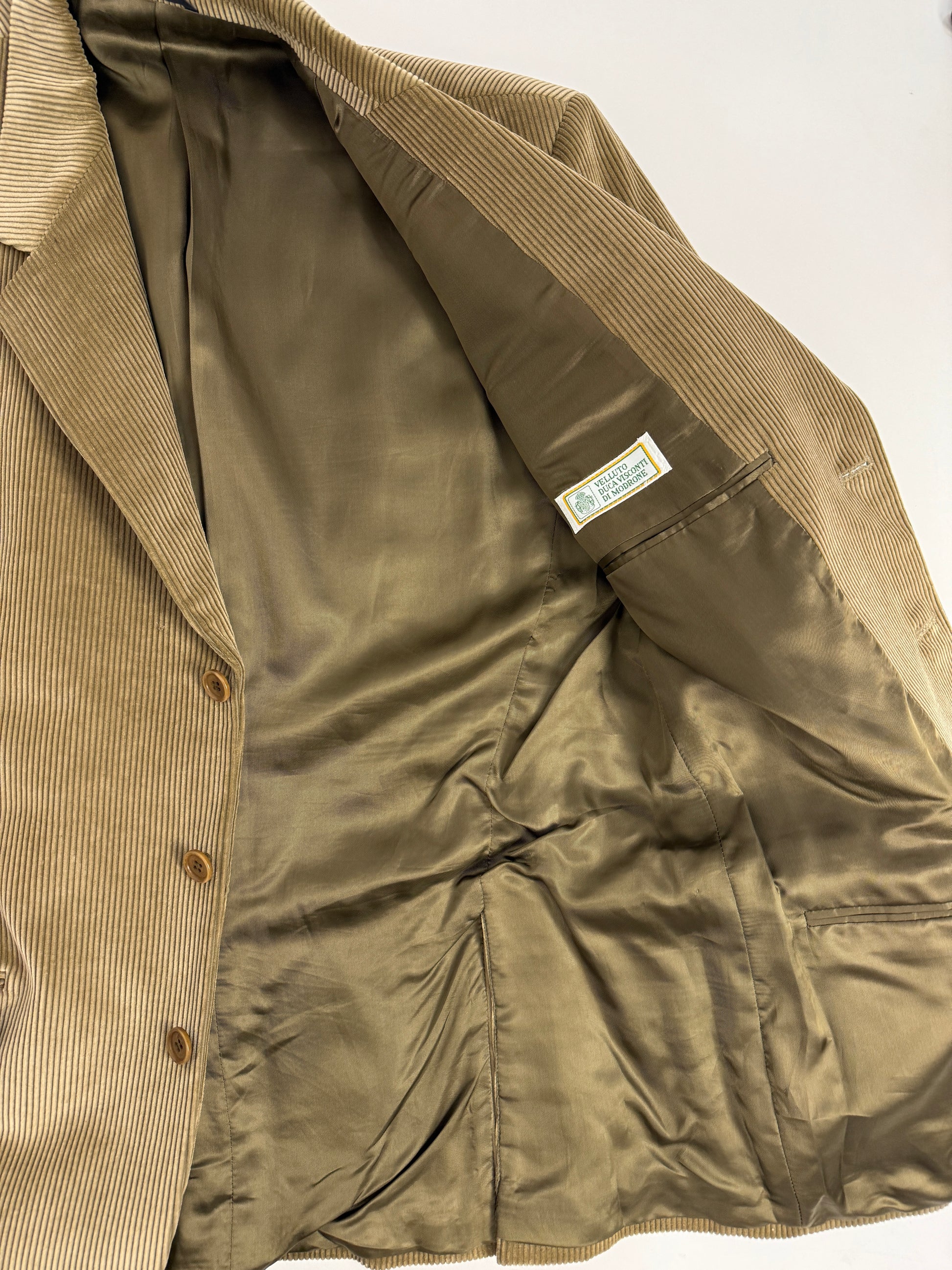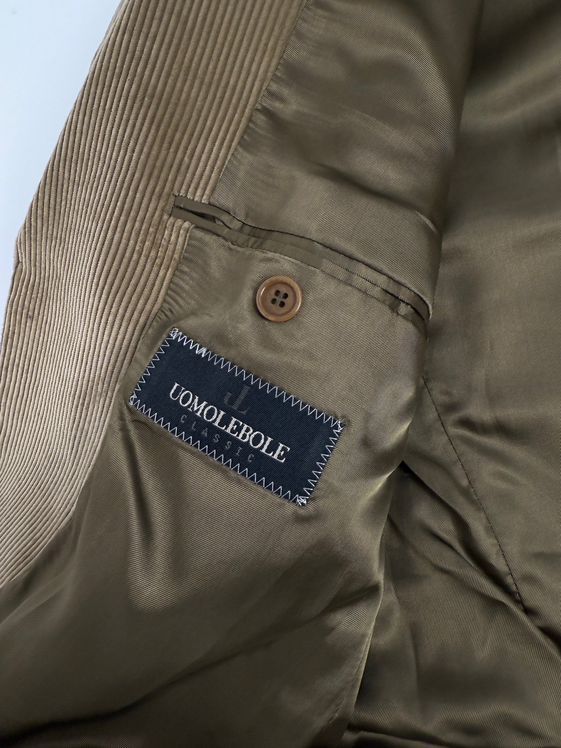 Realizzata in un velluto a coste medio-larghe dal tono beige caldo, questa giacca unisce il fascino del vintage al carattere deciso dei capi sartoriali italiani.