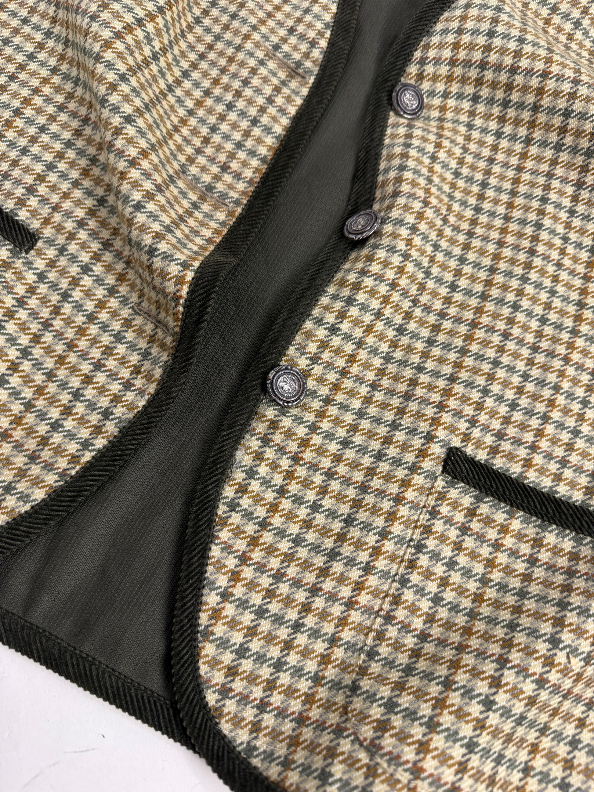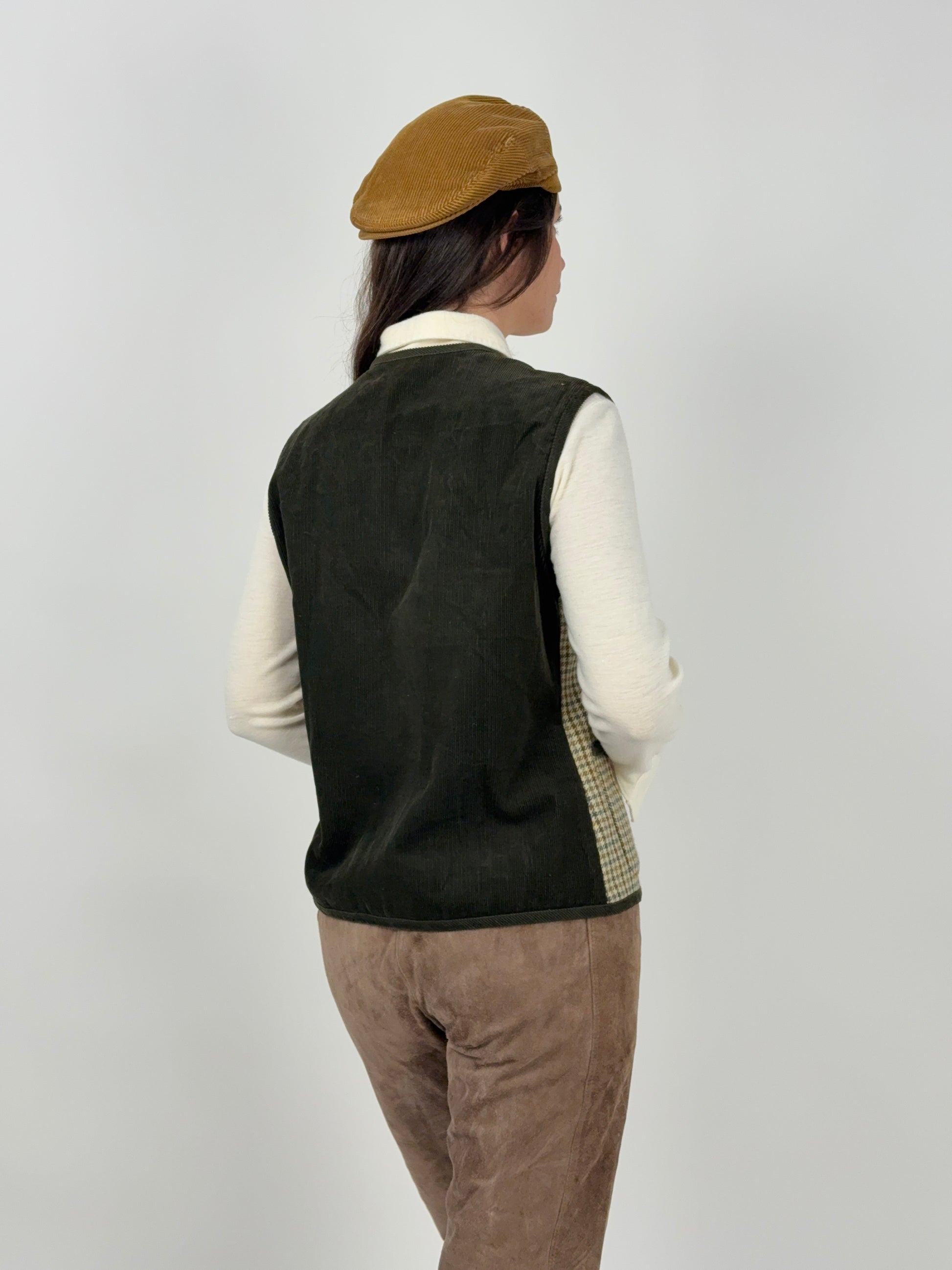 Eleganza country chic e qualità sartoriale si incontrano in questo gilet vintage, Made in Italy, realizzato tra i primi anni ’80. Il davanti è in morbido cotone con fantasia pied de poule nei toni caldi del beige, marrone e verde, mentre il retro è in velluto a coste verde scuro, dettaglio che aggiunge profondità e carattere al capo.