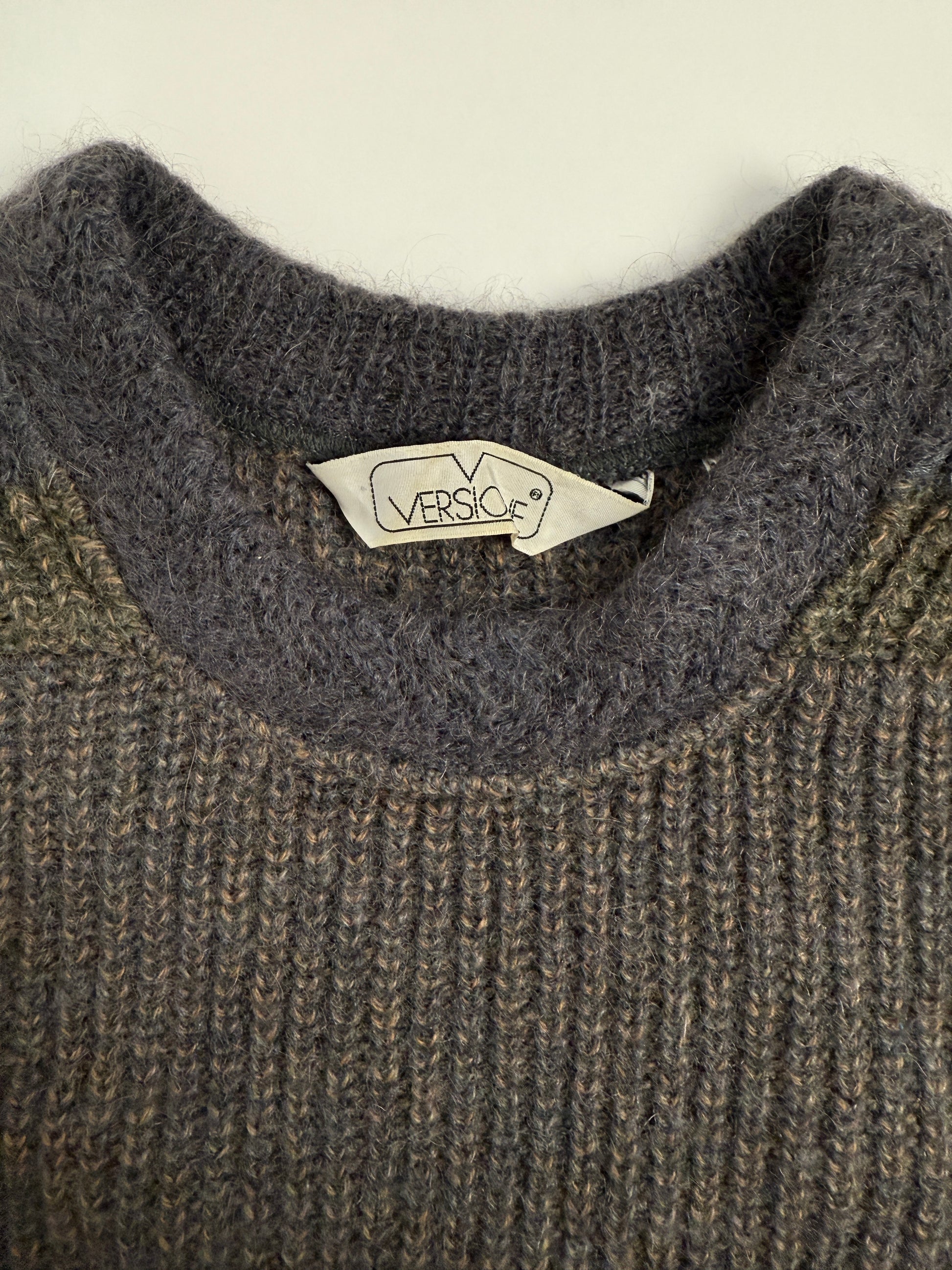 Questo maglione vintage Versione, realizzato negli anni ’80, rappresenta una delle più belle espressioni della maglieria artigianale italiana, costruito in lana e mohair per garantire calore, leggerezza e texture ricca di profondità.