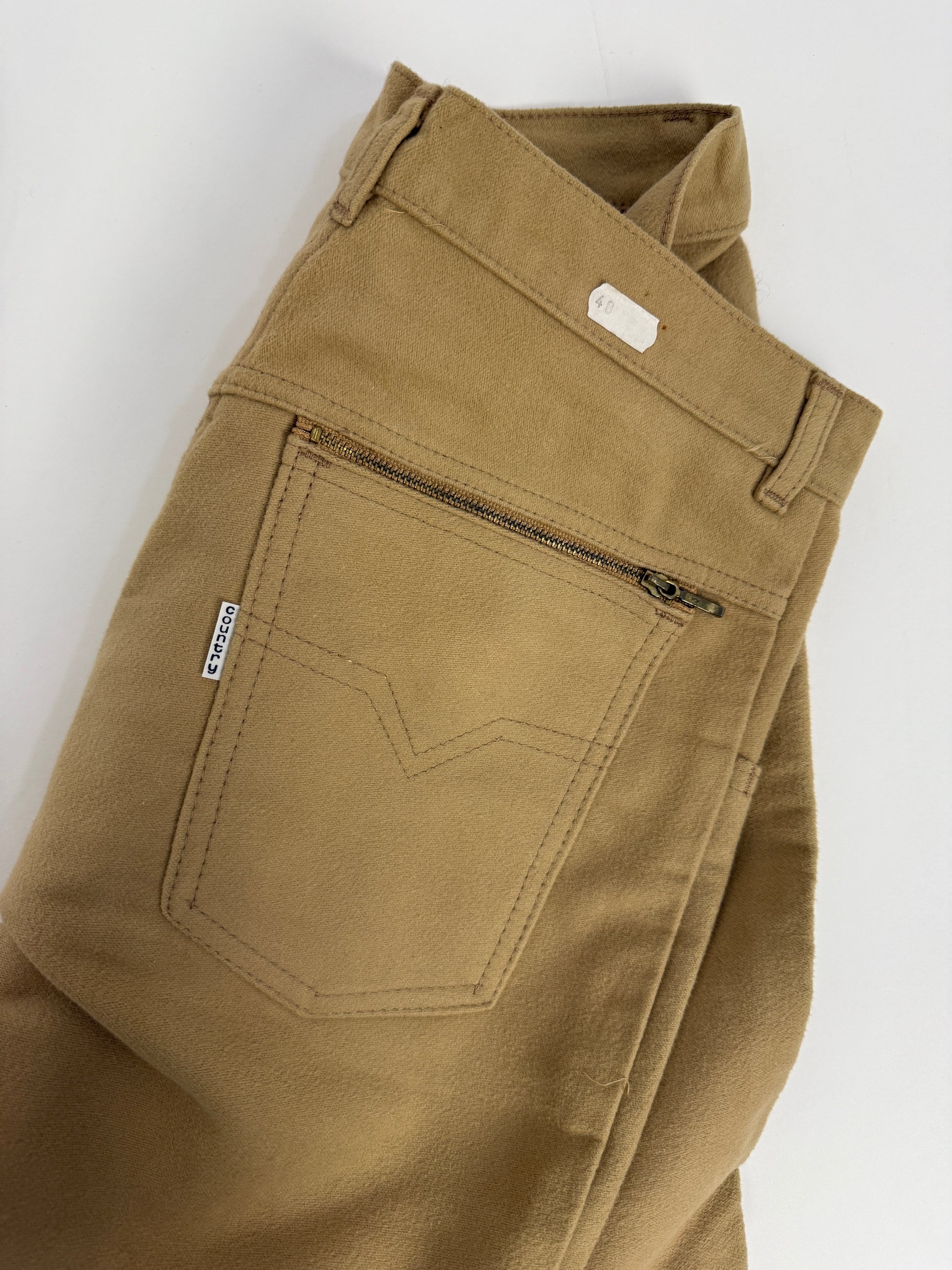 Realizzati in cotone pesante color cammello, hanno la struttura solida dei pantaloni da lavoro dell’epoca: vita alta, taglio dritto, cuciture rinforzate, tasche profonde e una splendida tasca posteriore con zip. Sono pantaloni che durano una vita, perfetti per chi apprezza il design funzionale, le linee pulite e il feeling “old school” del vero workwear italiano.