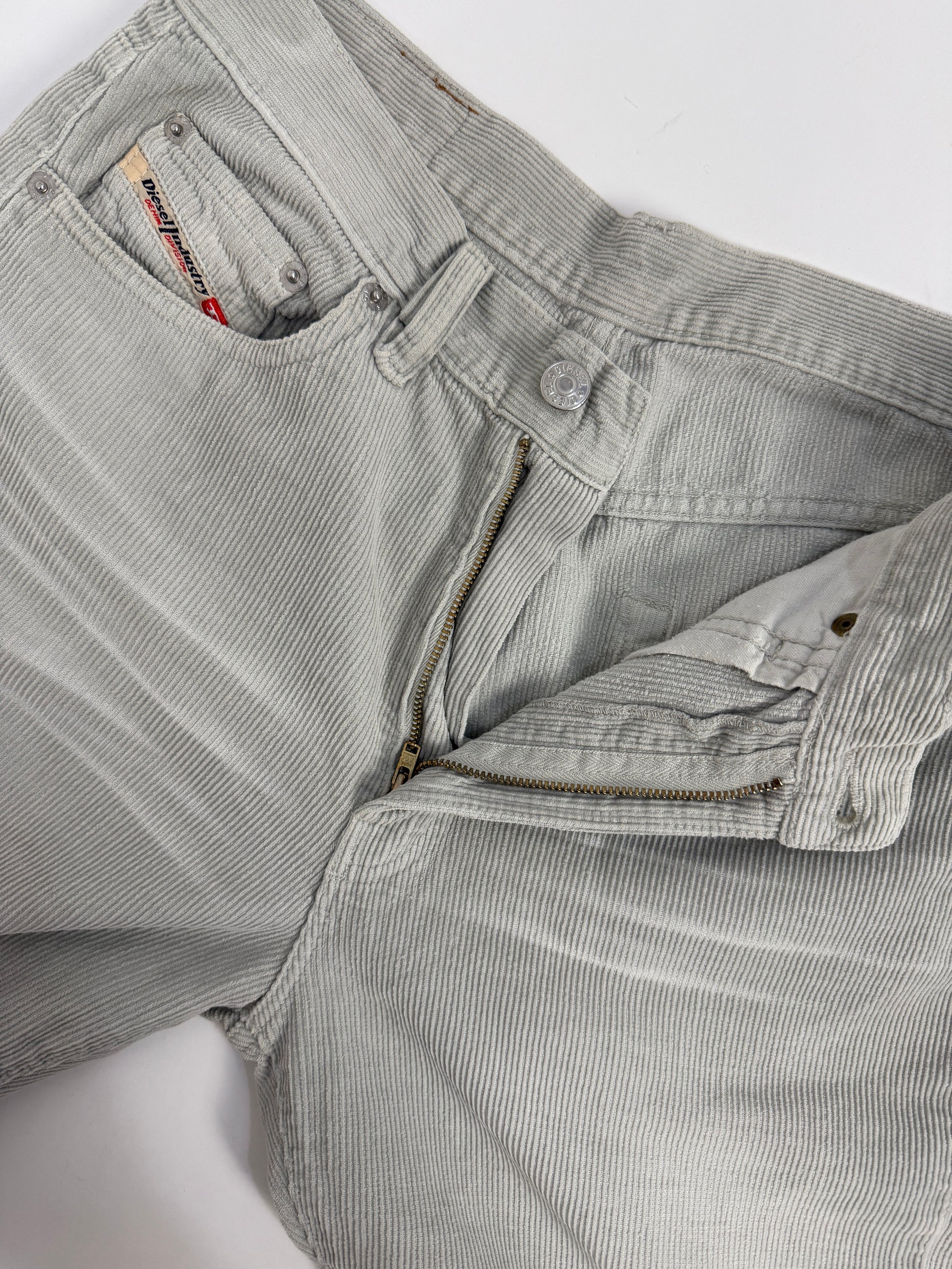 Questi pantaloni vintage in velluto a coste grigio chiaro, firmati Diesel Industry: taglio dritto, vita media e un fit che valorizza la silhouette mantenendo il comfort.