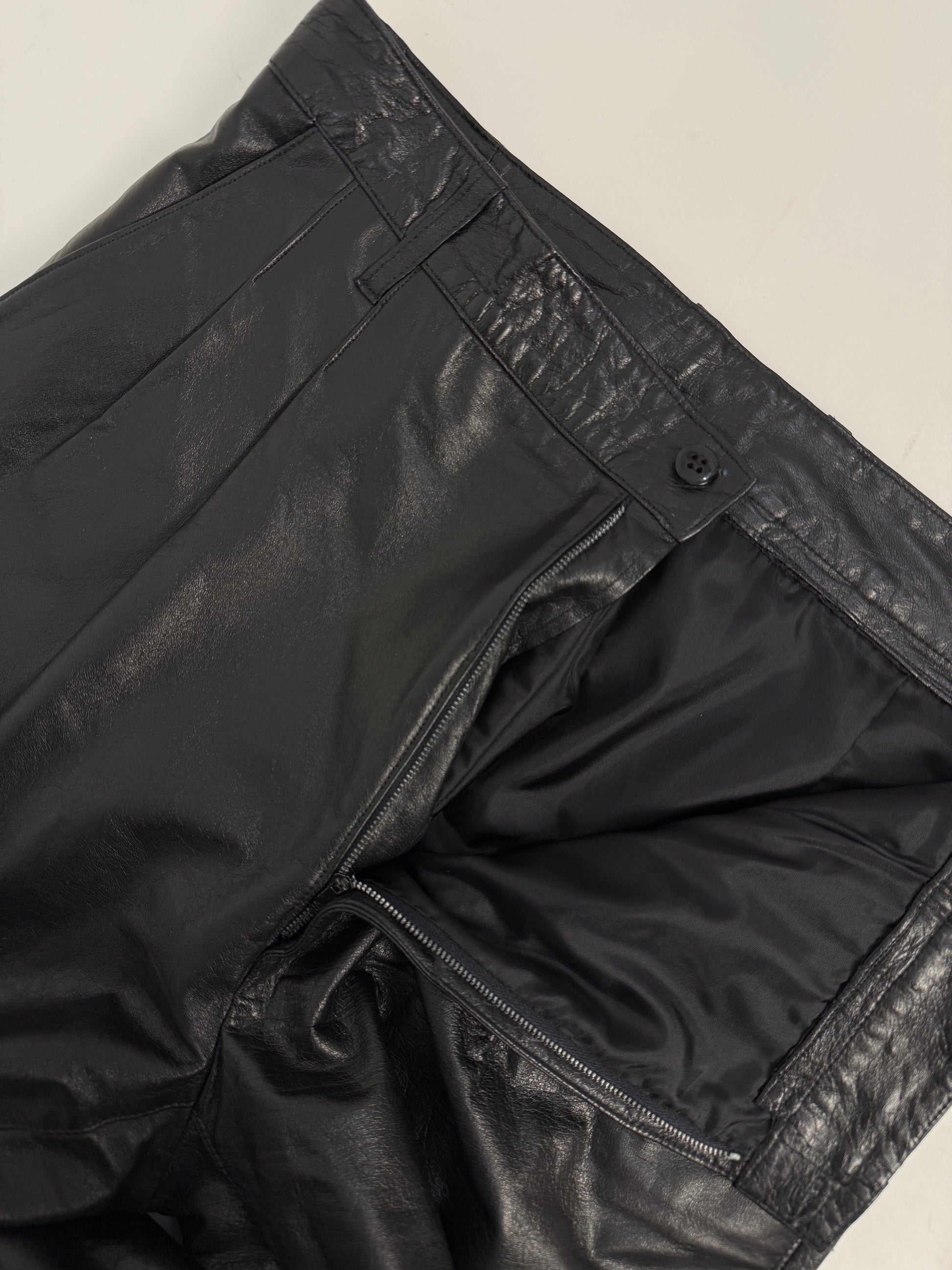 Un classico rock dal taglio rilassato: morbidi pantaloni in vera pelle nera, con vita medio-alta, pinces frontali e passanti per cintura. La gamba dritta e piena cade lunga creando un bellissimo effetto over-boot