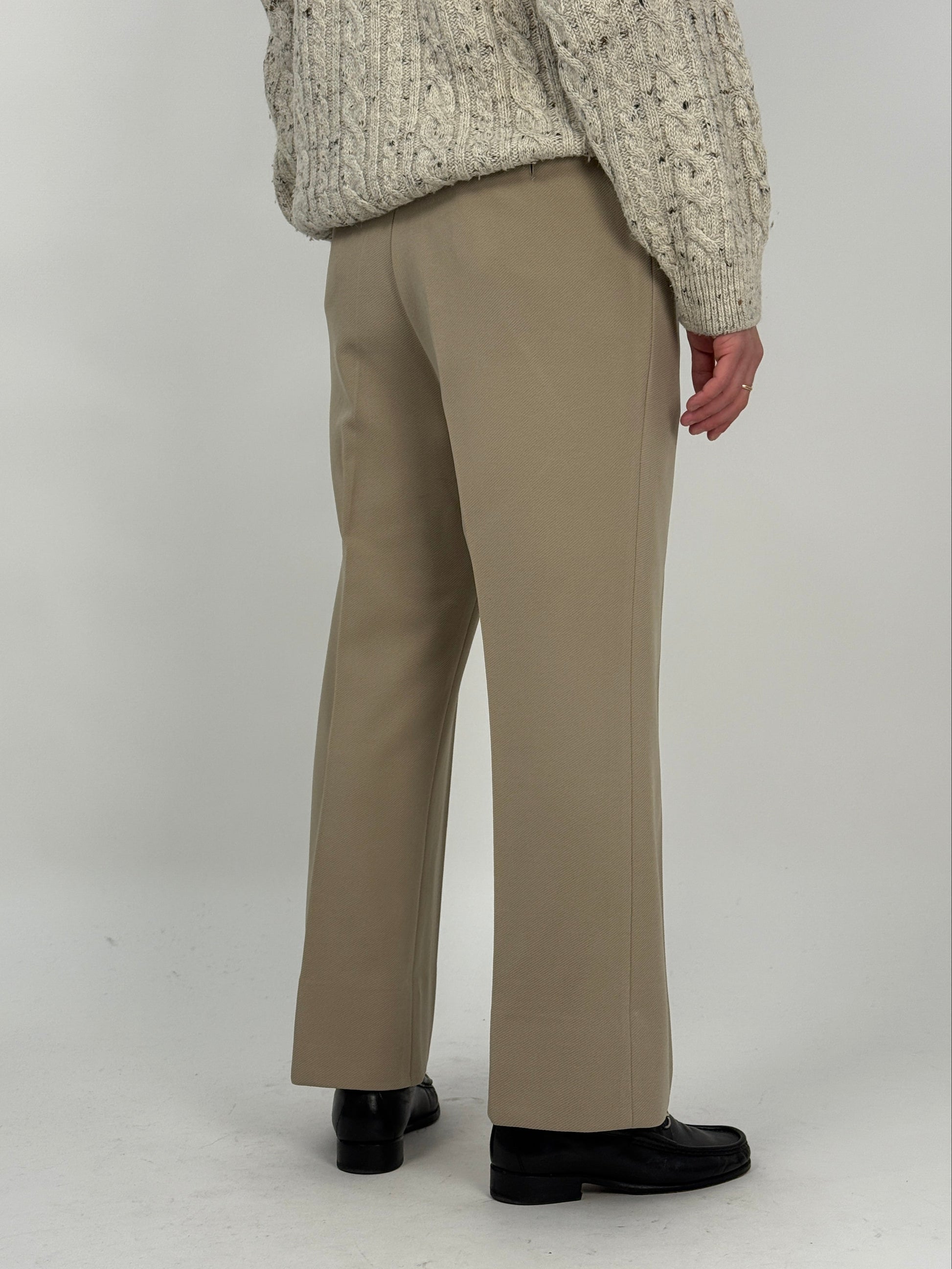 Pantaloni sartoriali realizzati in Italia negli anni ’70 con un raffinato tessuto color beige chiaro a trama diagonale, confezionati da Lanerossi.