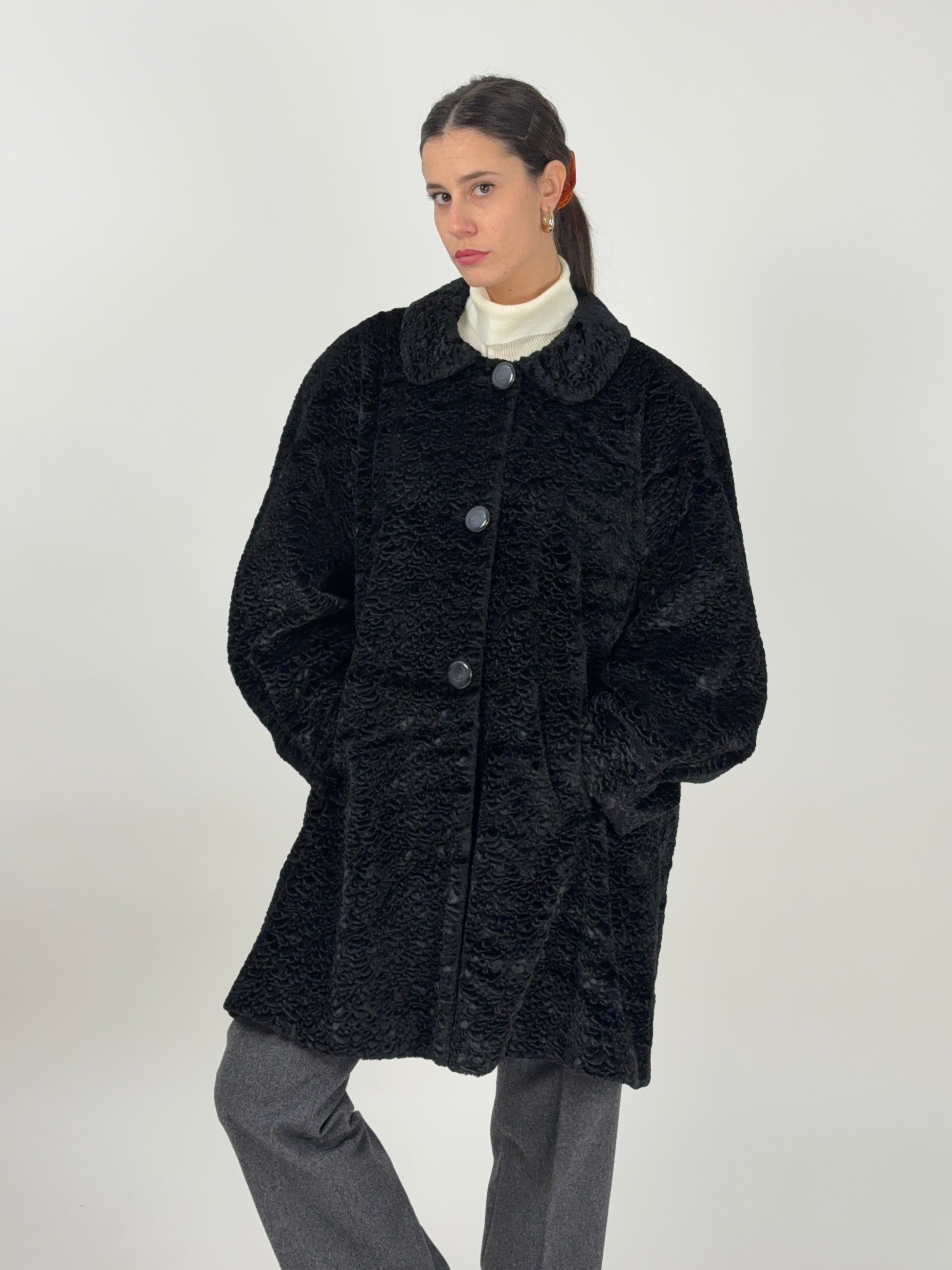 Chiusura a bottoni maxi, collo rotondo, interno completamente foderato: un cappotto che scalda tanto quanto eleva qualsiasi outfit.