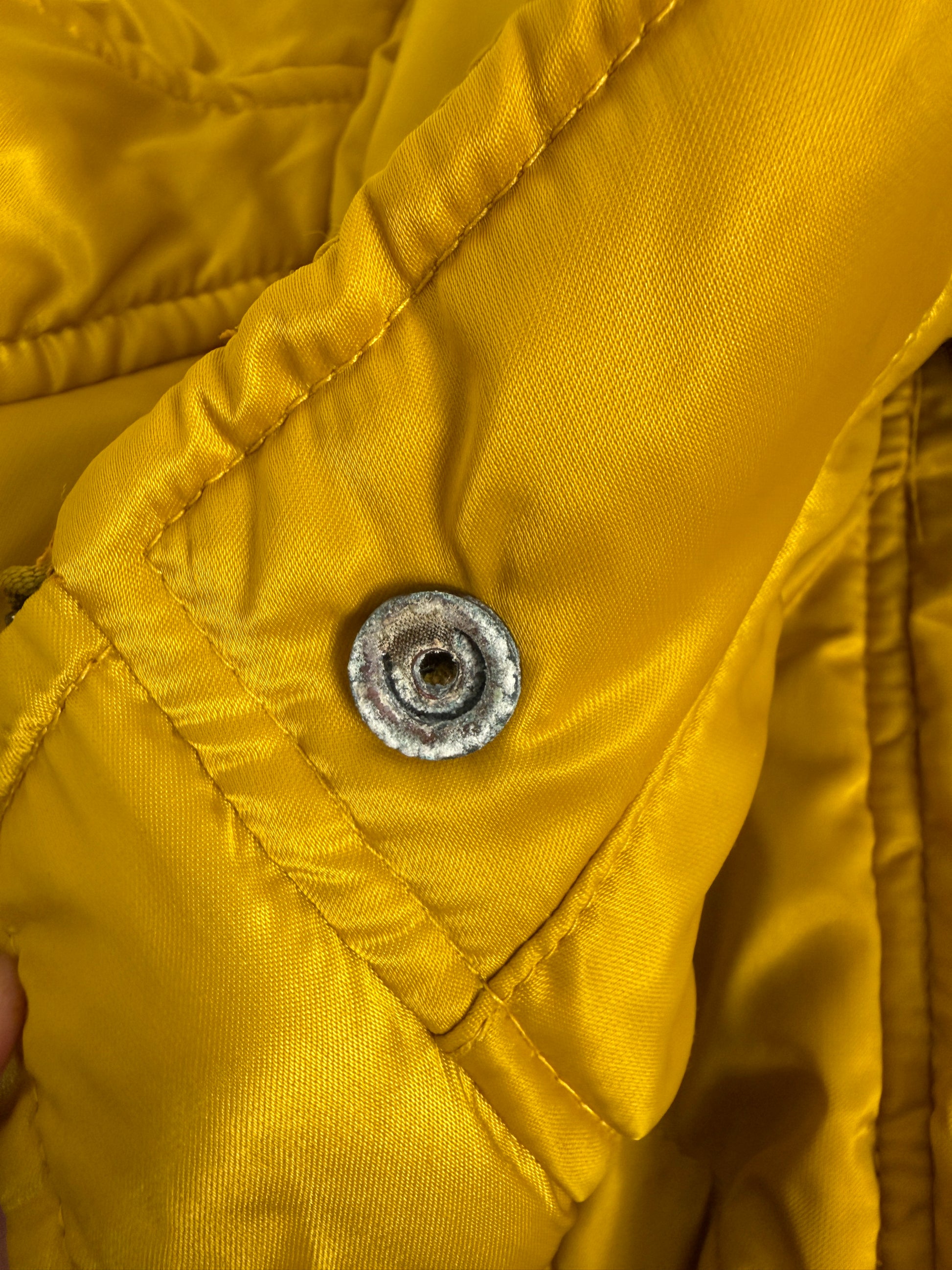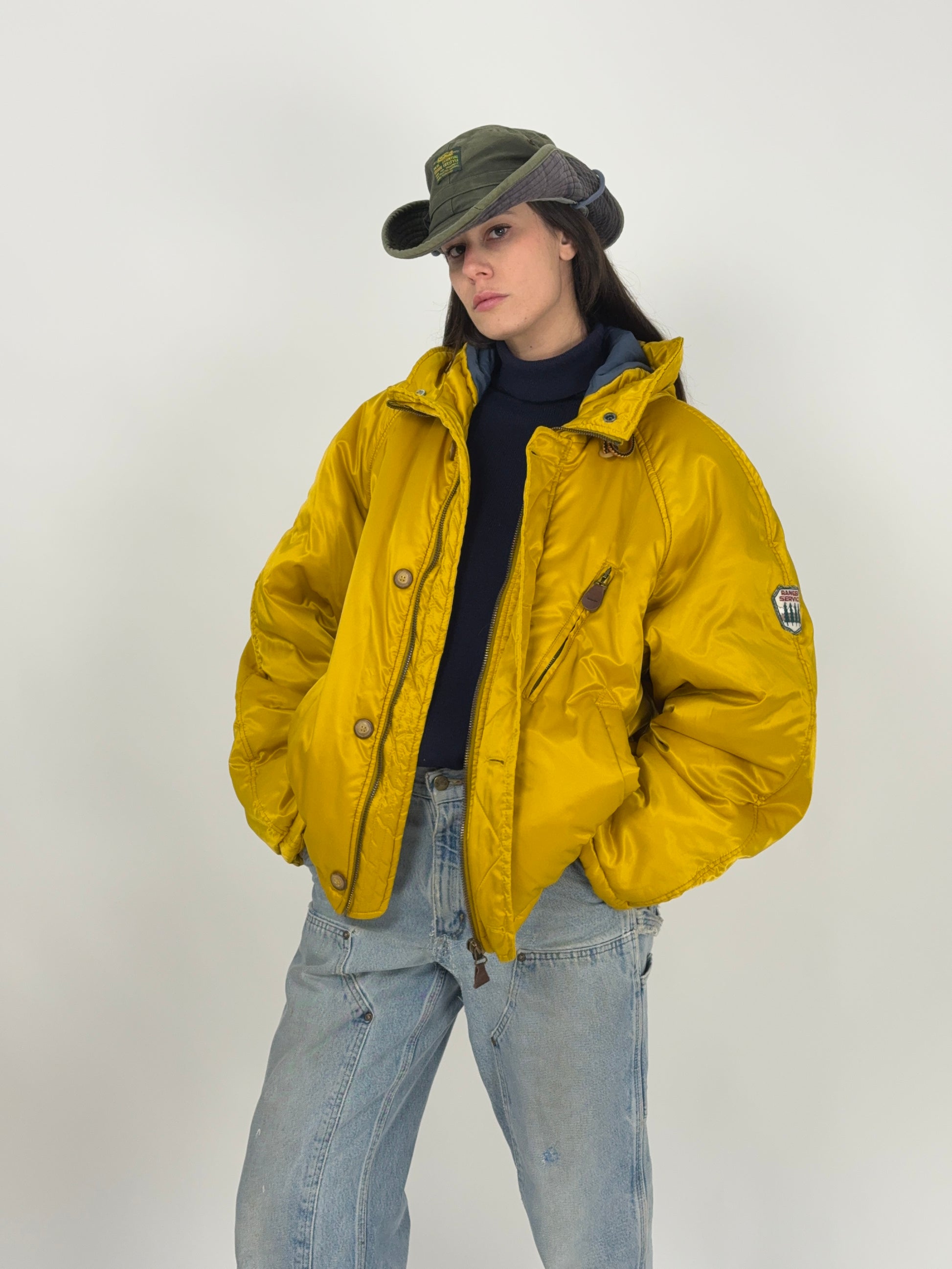 Realizzata in un giallo oro brillante, è un capo che unisce performance e stile, con dettagli d’epoca come la zip in metallo, i bottoni a pressione, il logo patch “Ranger Service” e l’interno blu navy.