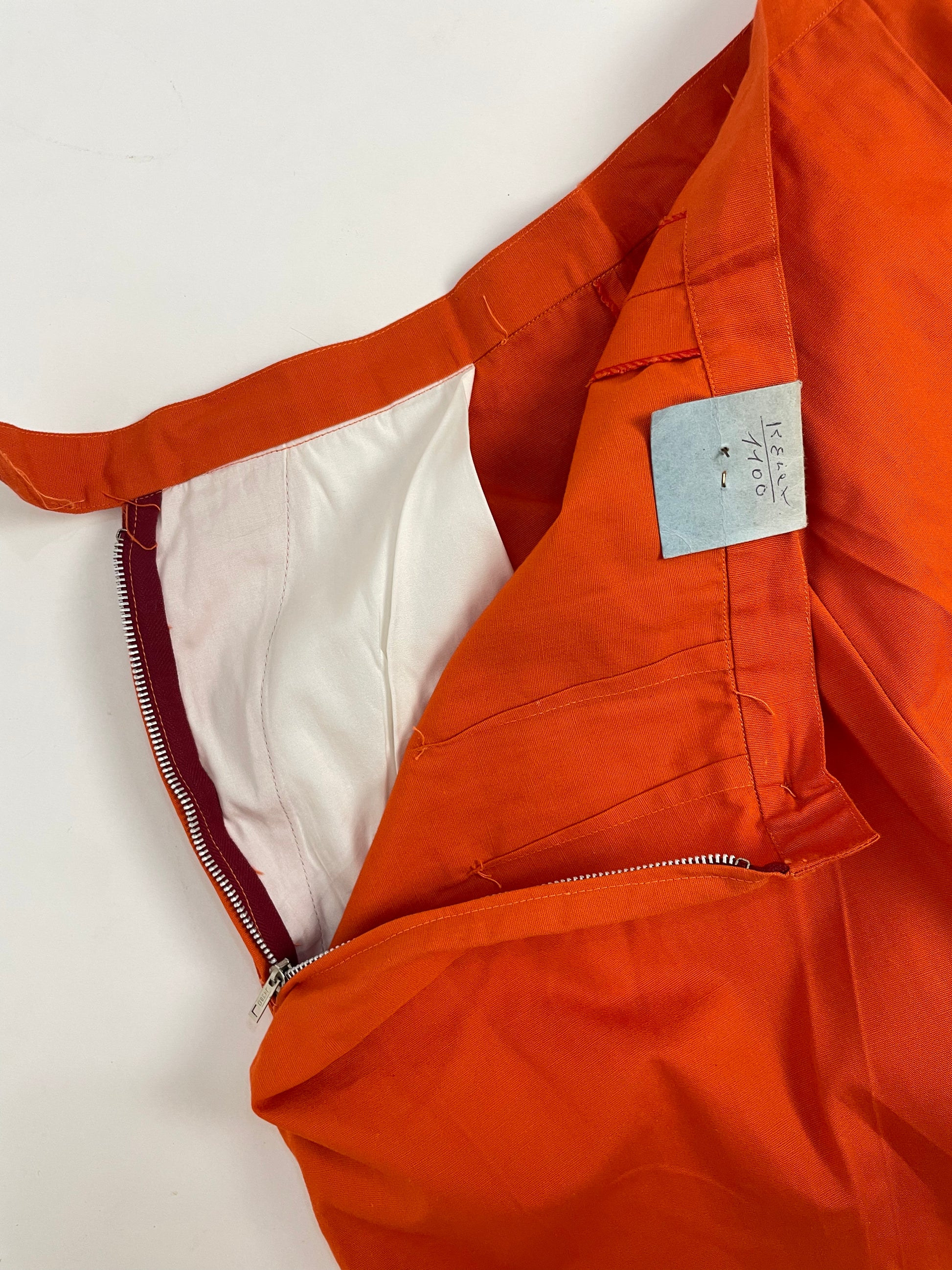 Questi shorts deadstock (mai indossati) in cotone/tela leggera accendono l’outfit con un arancione pieno e una costruzione sartoriale pulita: vita alta con passanti, pinces che slanciano, tasche alla francese e pratica chiusura laterale con zip + bottone. La gamba corta e netta disegna una silhouette essenziale e femminile. Perfetti con canotta bianca, camicia in lino o polo fitted per un look Mediterranean summer dal gusto rétro