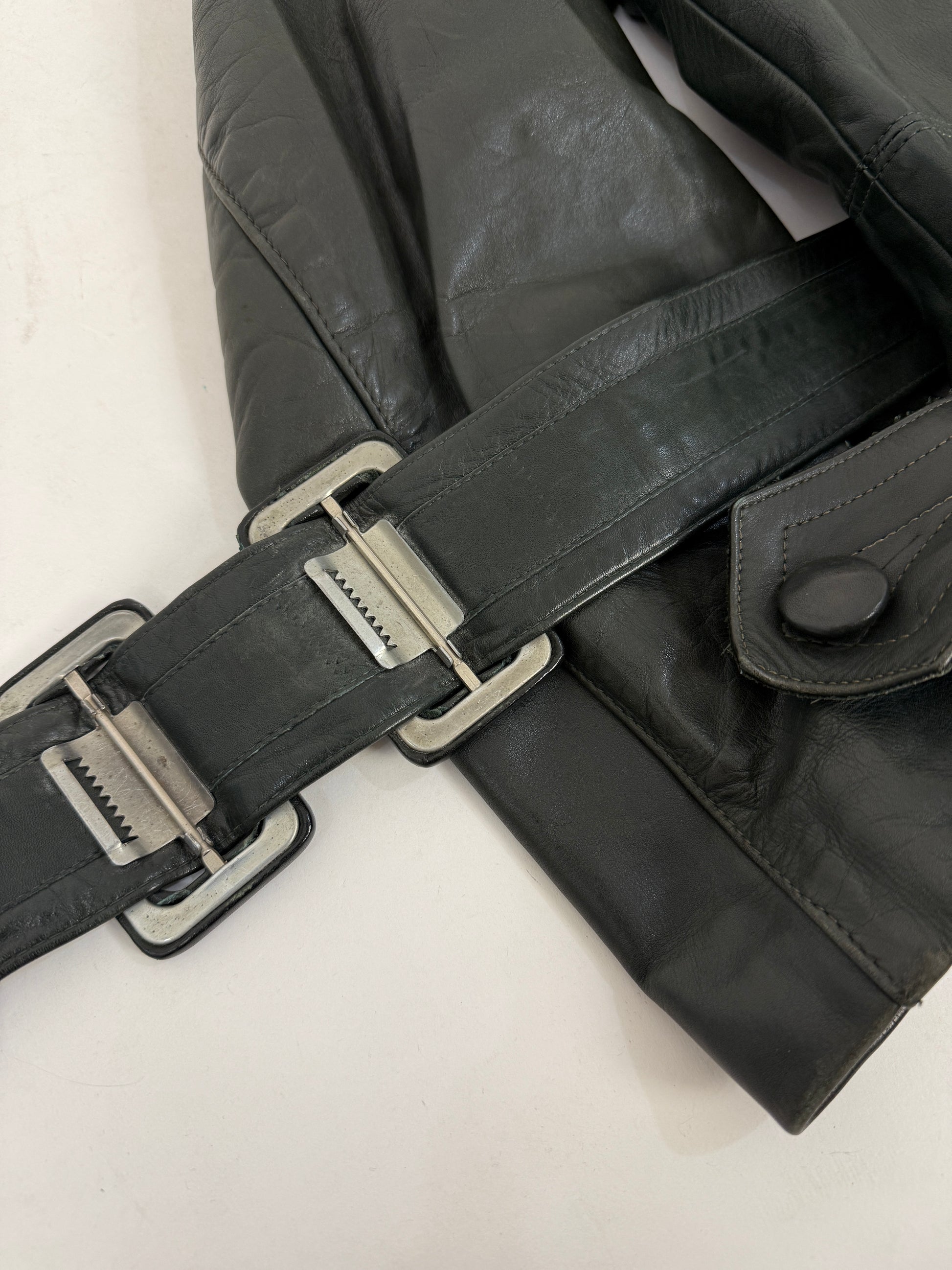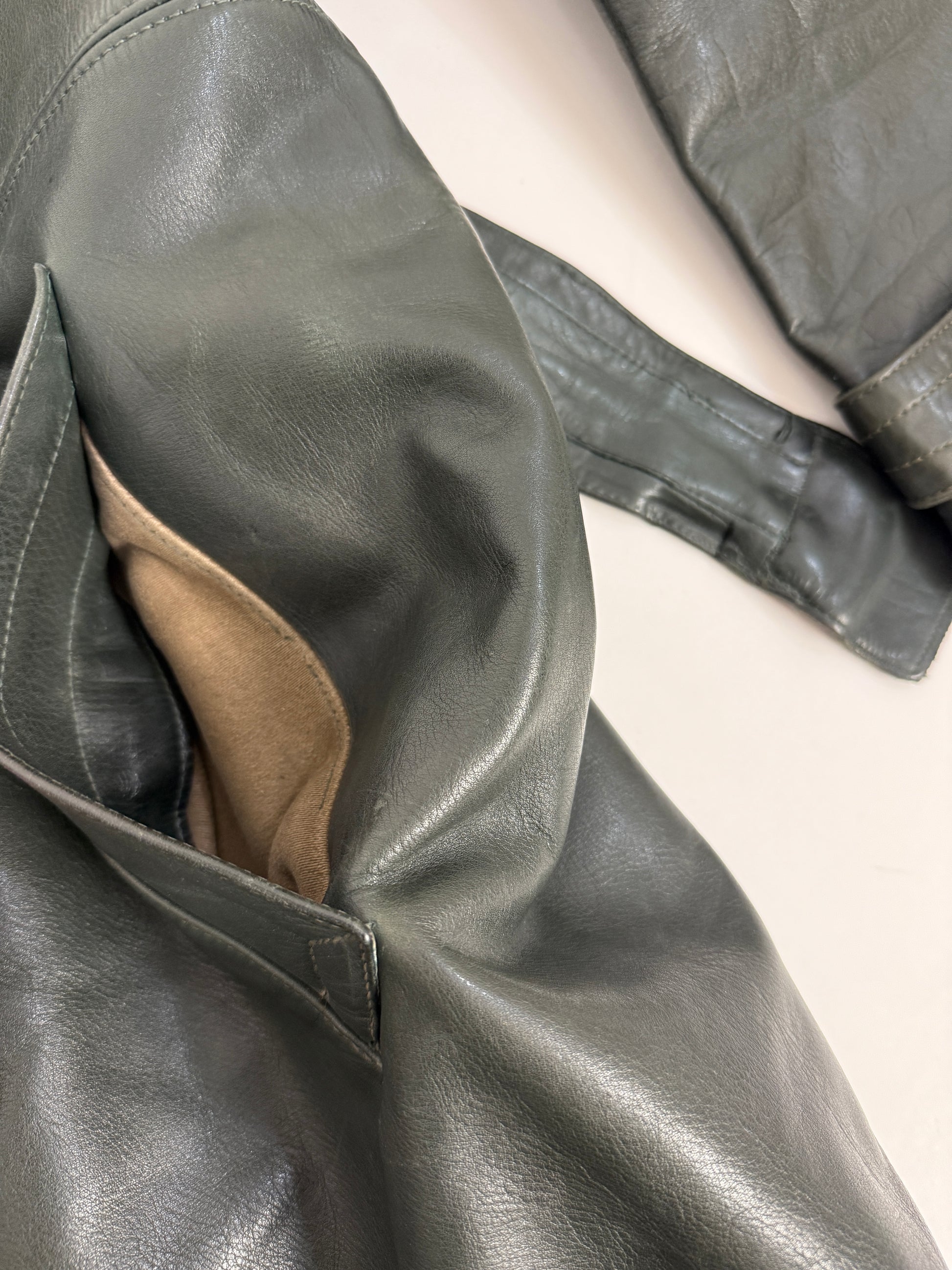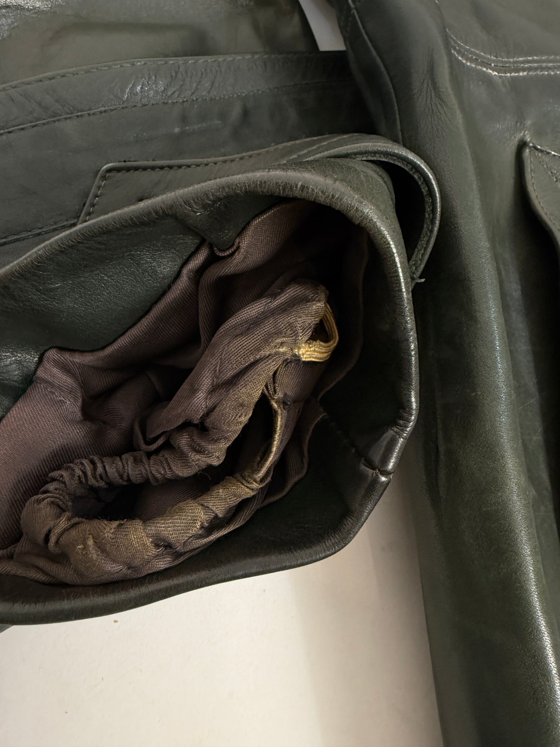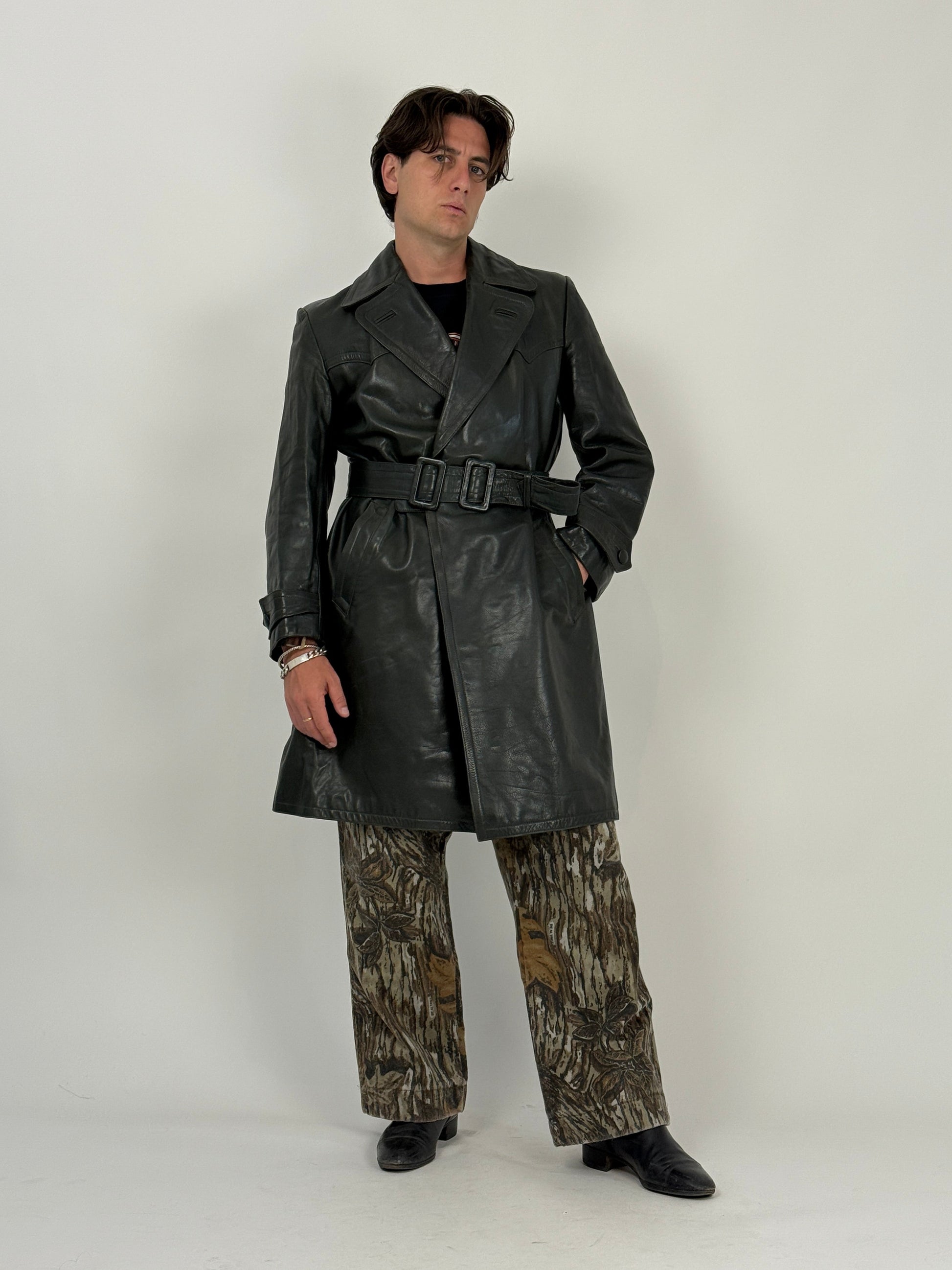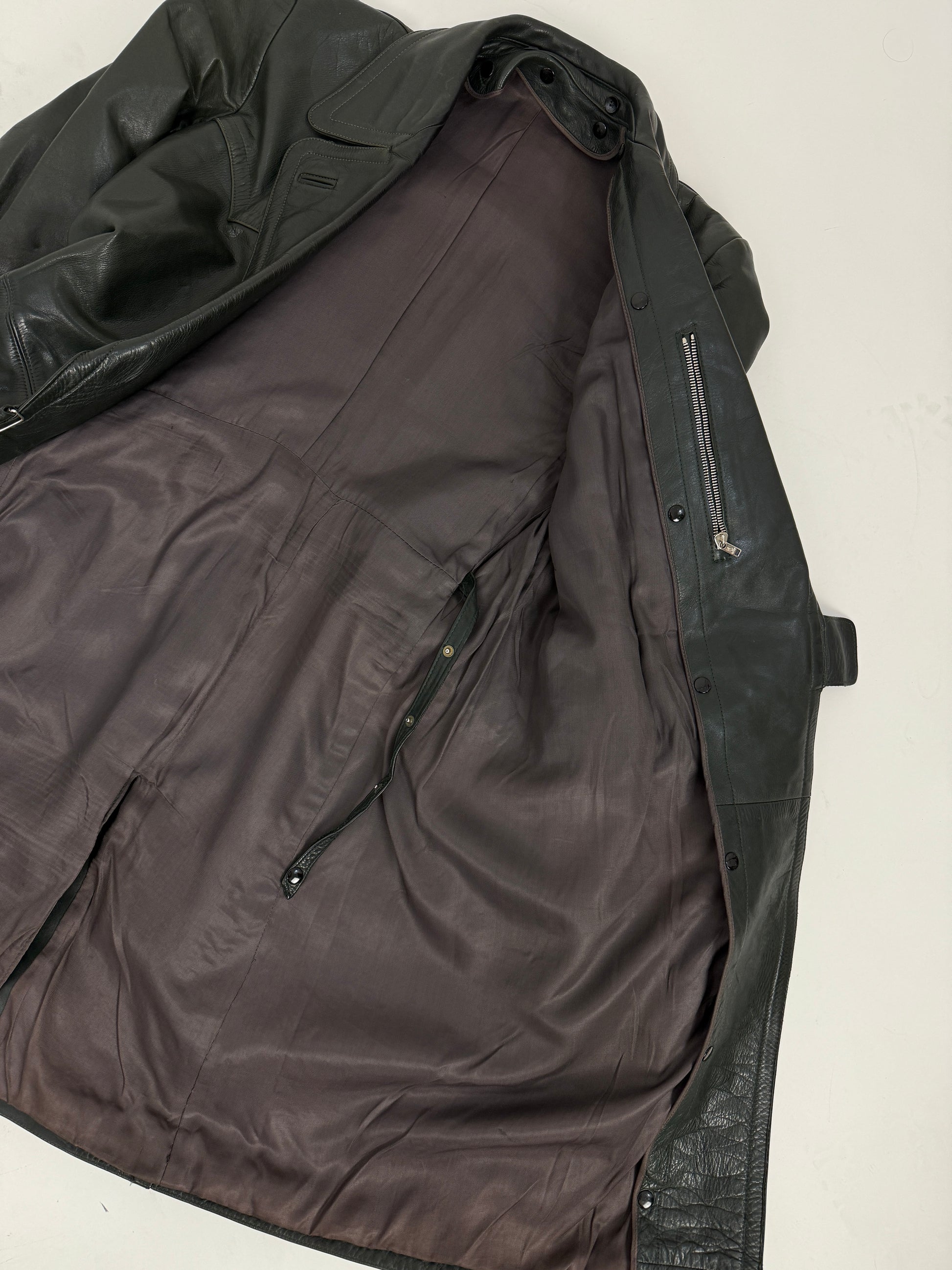 Realizzato da WEB Freiberger Lederbekleidung, presenta pelle spessa con splendida patina, ampi rever a lancia, chiusura frontale con cintura originale a doppia fibbia metallica, tasche a patta, cinturini ai polsi, spacco posteriore e tasca interna con zip dove è cucita l'etichetta del produttore. La fodera integrale in tono tabacco e le cuciture rinforzate raccontano l'uso professionale di un capospalla concepito per servizio che doveva durare