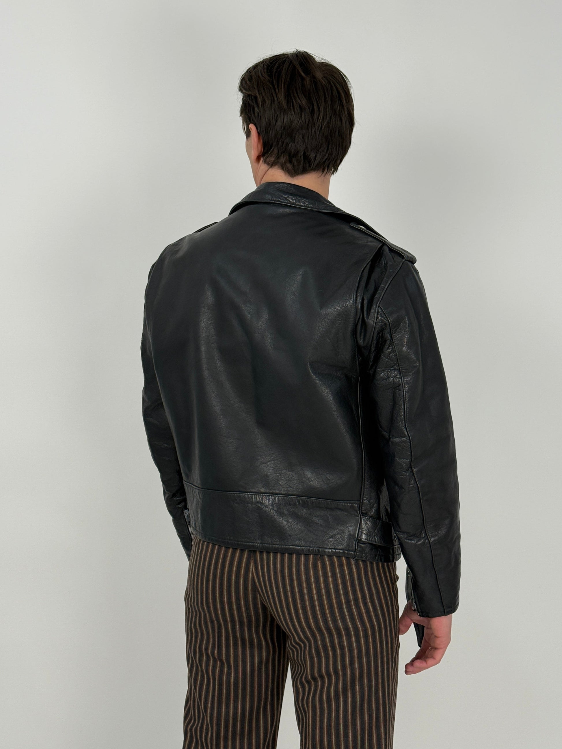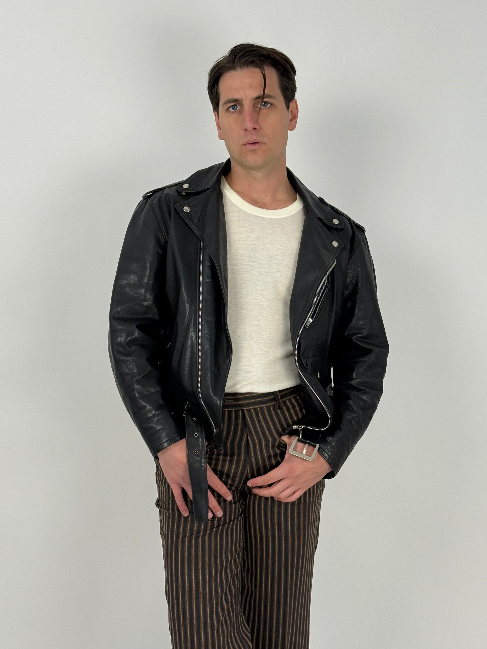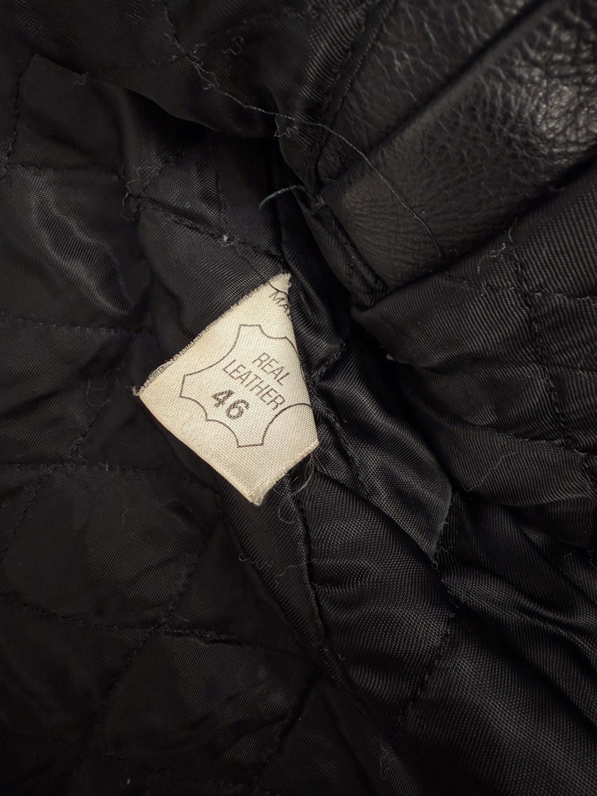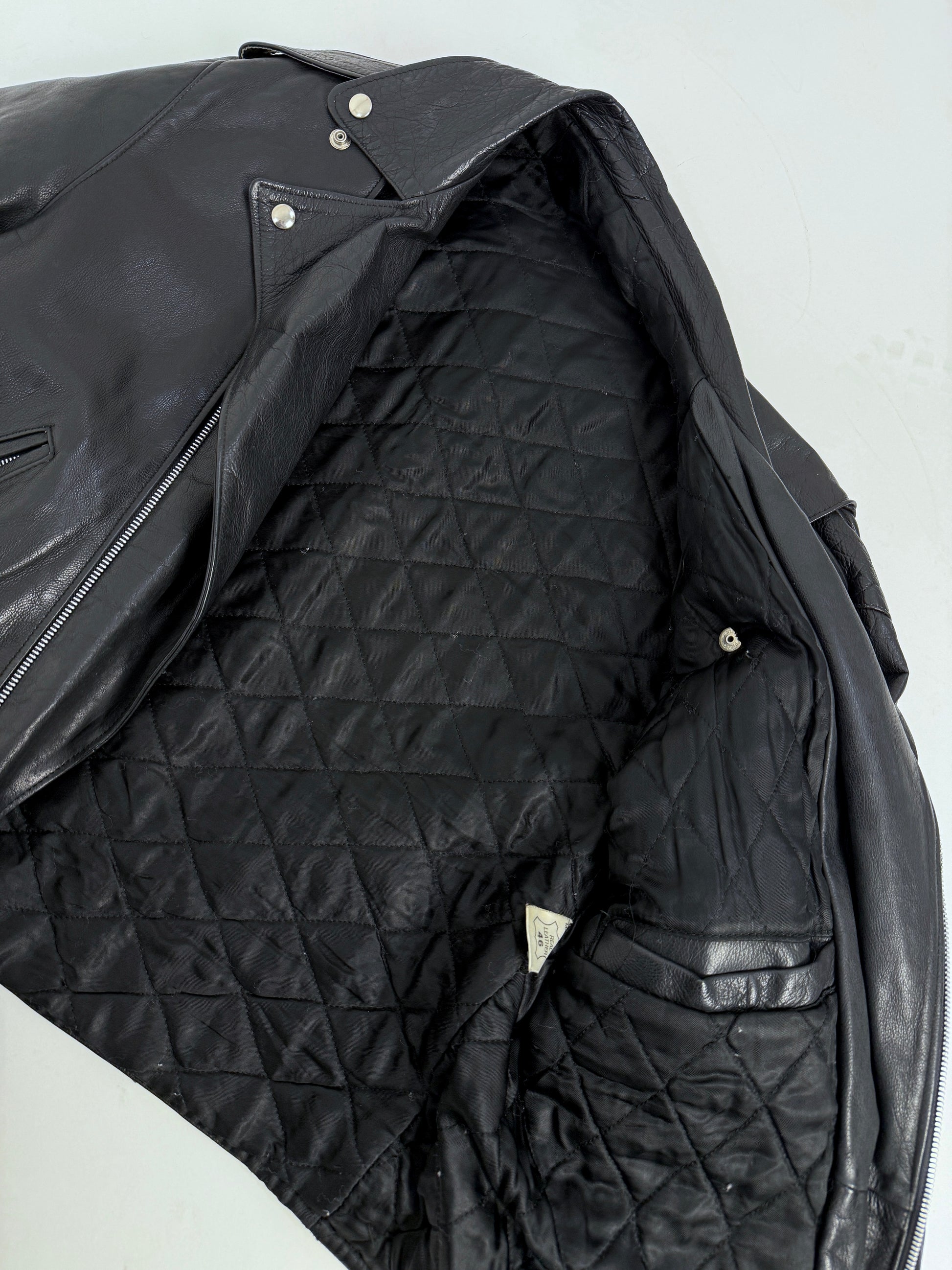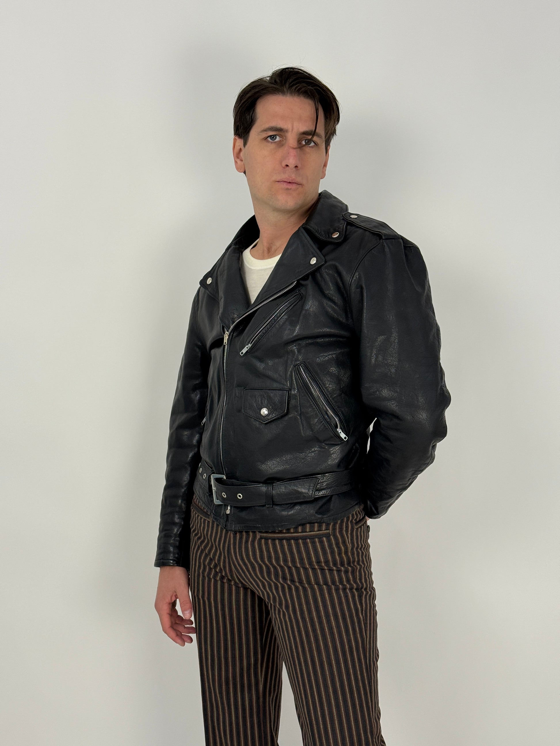 Giacca biker in vera pelle nera vintage anni ’80 rappresenta lo spirito ribelle delle sottoculture rock e motociclistiche.