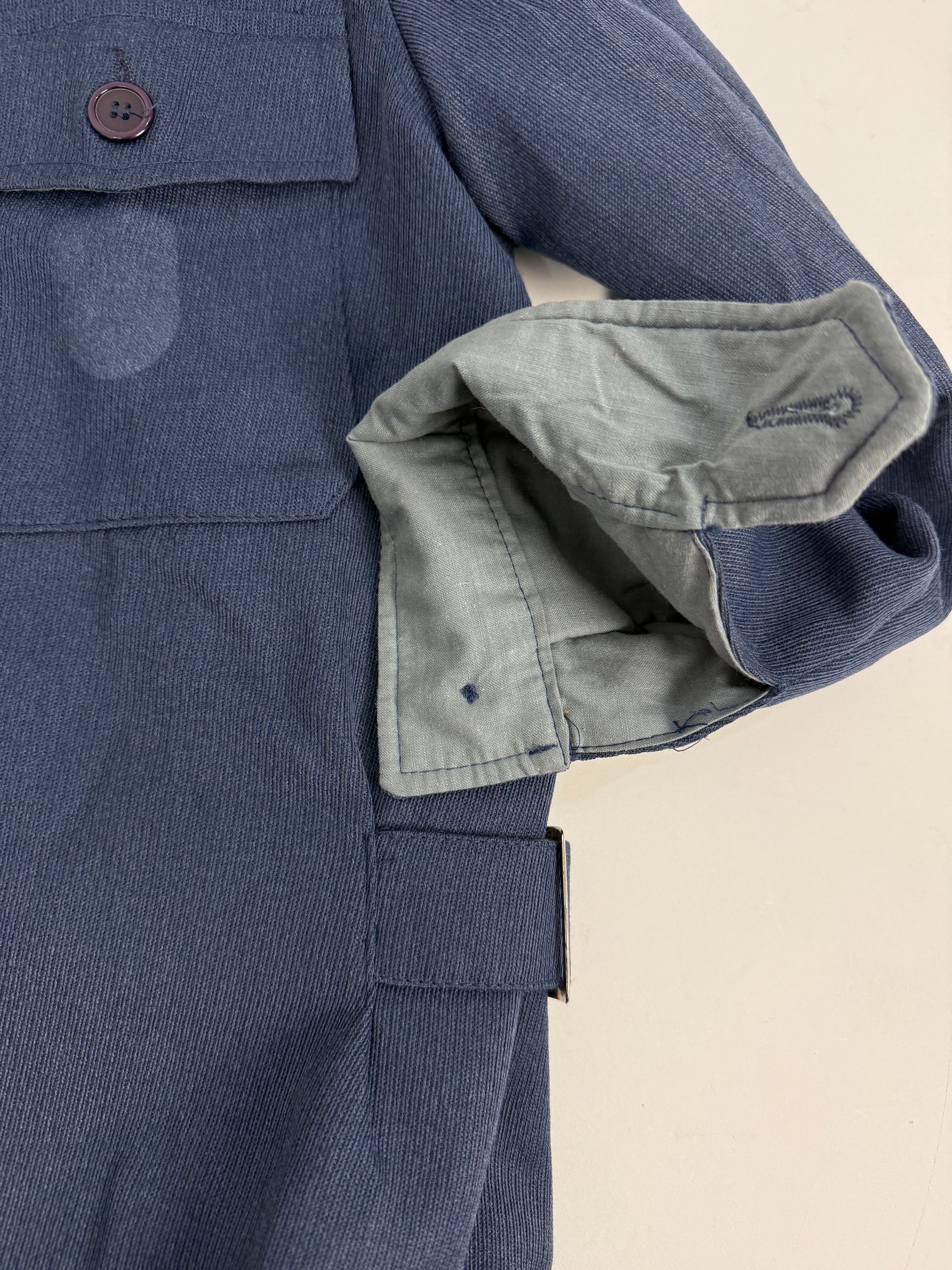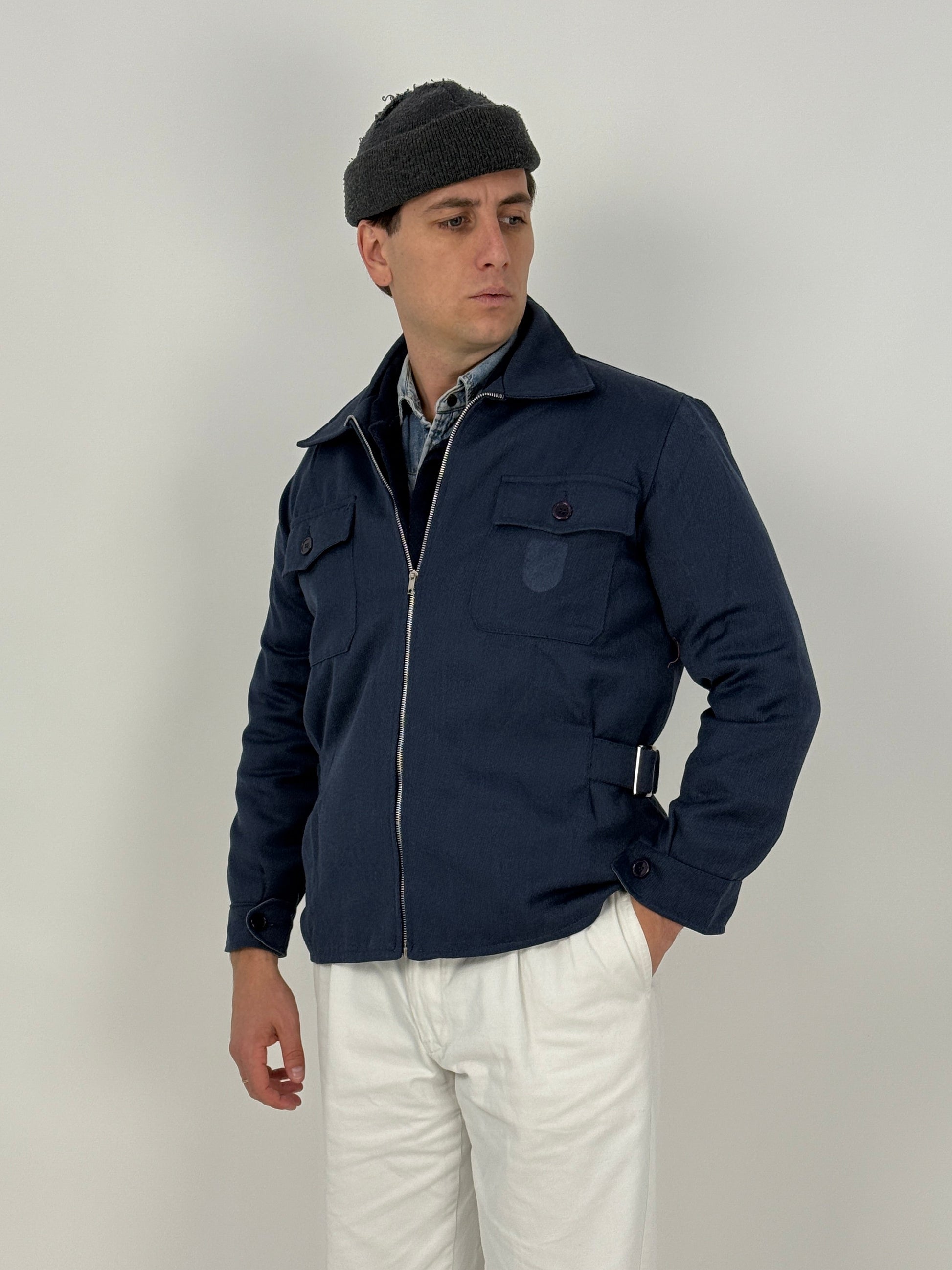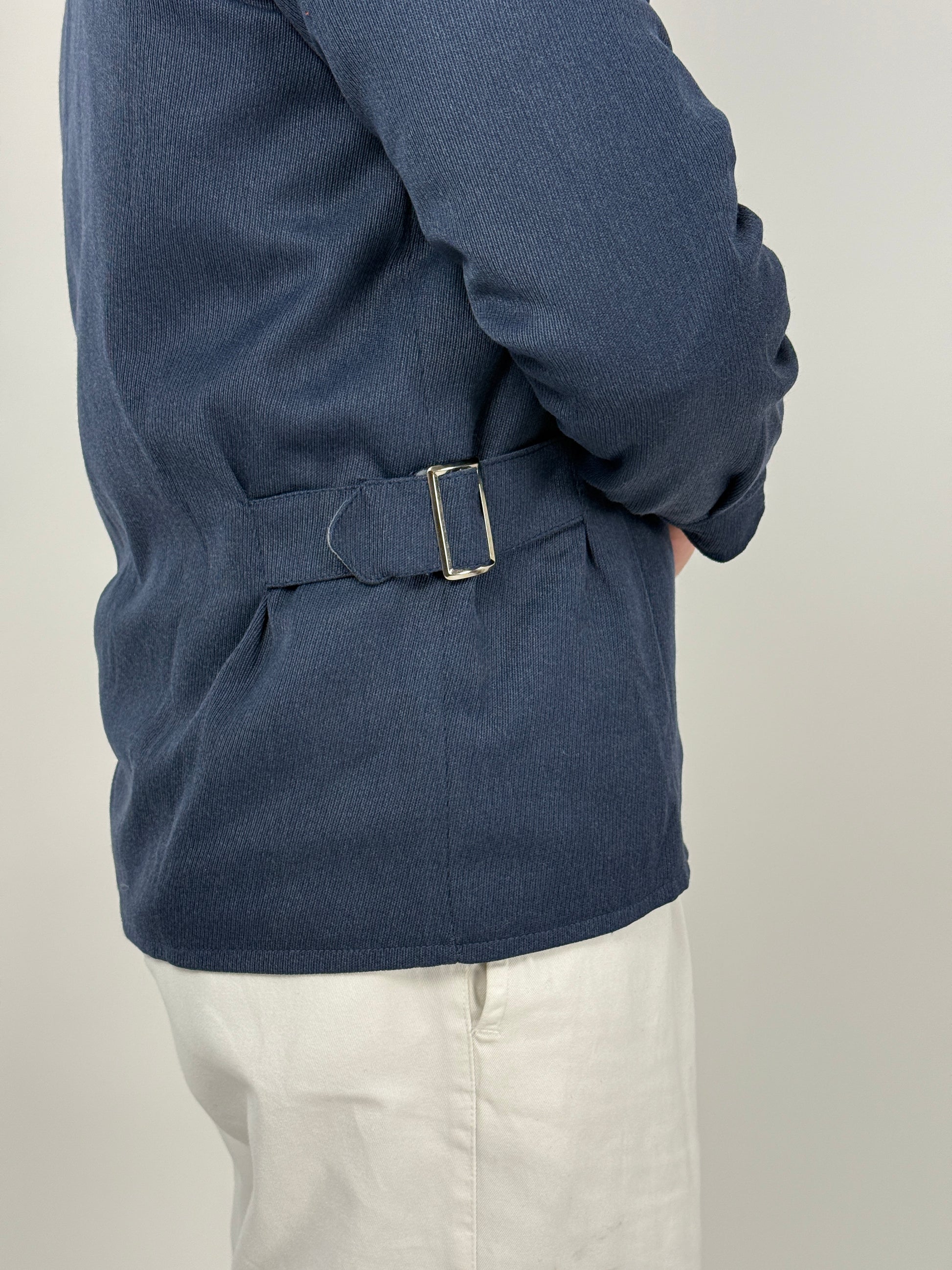 Questa giacca da lavoro vintage blu rappresenta l’essenza del workwear italiano: resistente, essenziale e incredibilmente elegante nella sua semplicità.