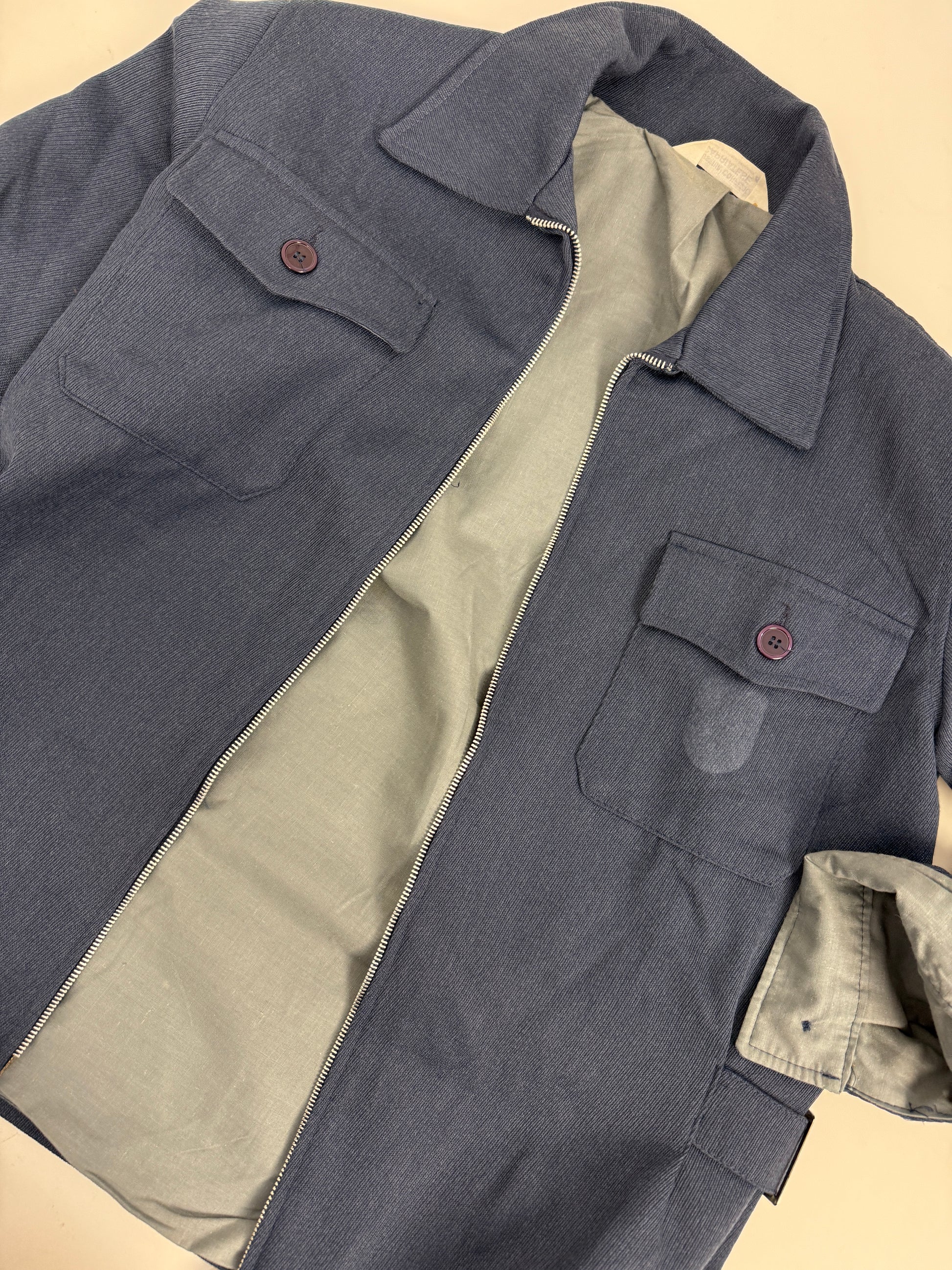 Realizzata in cotone robusto a trama fitta, presenta tasche frontali con pattina e bottoni tono su tono, chiusura a zip metallica e regolatori laterali con fibbia in metallo, dettaglio tipico delle divise industriali italiane dell’epoca.