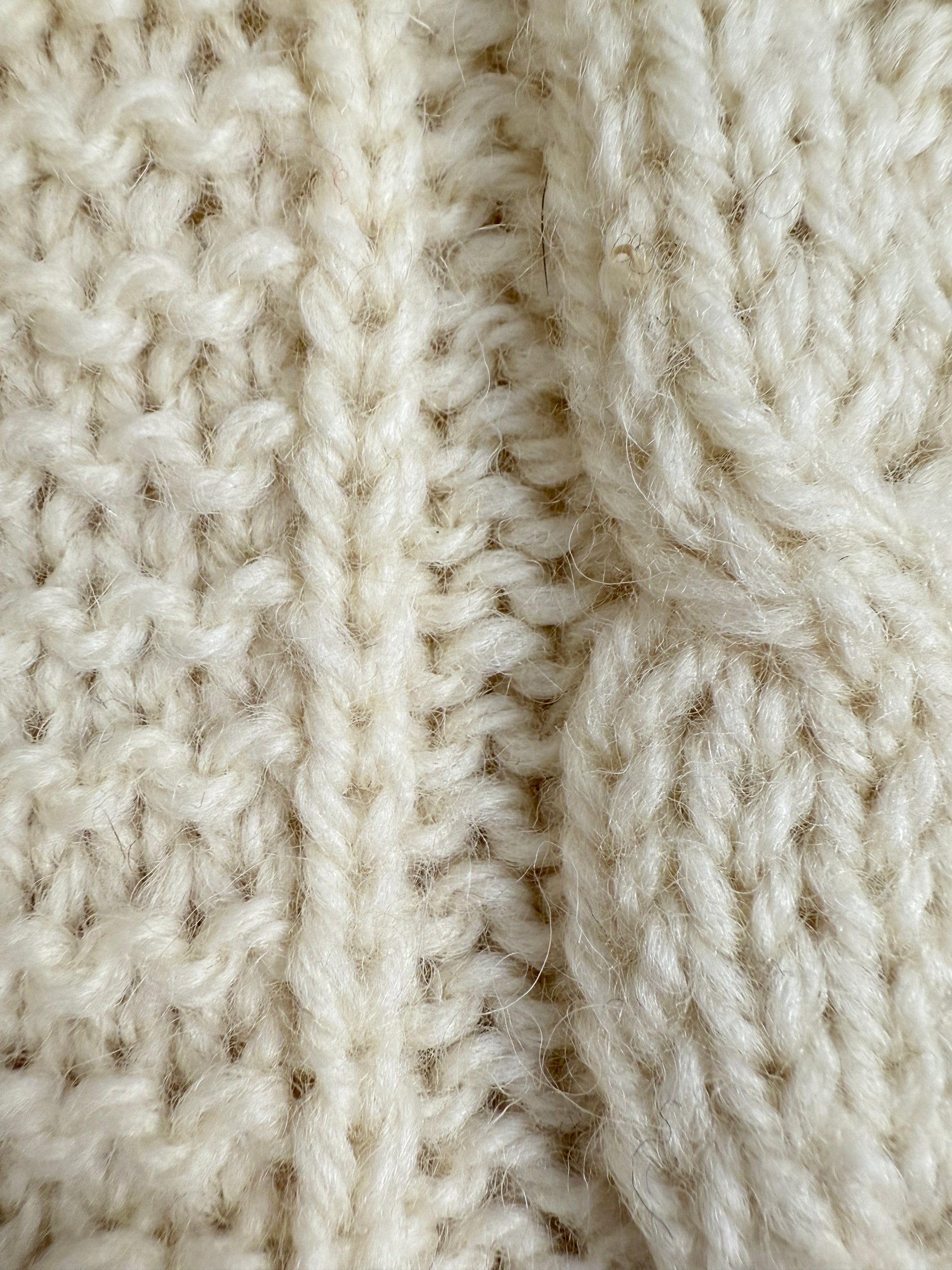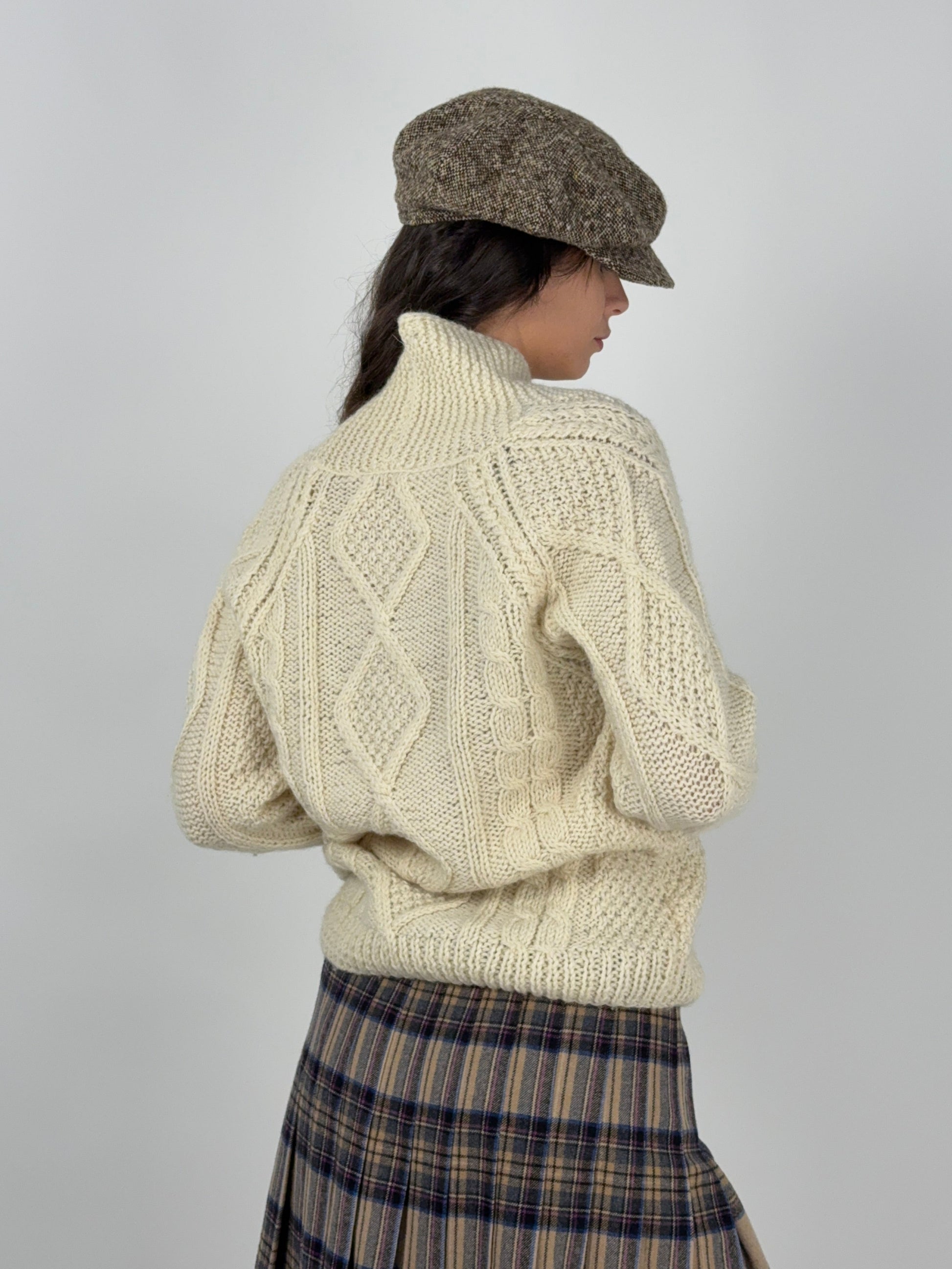Maglione vintage realizzato in pura lana con classico motivo a trecce e lavorazione artigianale. Il collo sciallato e la texture calda lo rendono un capo senza tempo, perfetto per chi cerca qualità e autenticità.