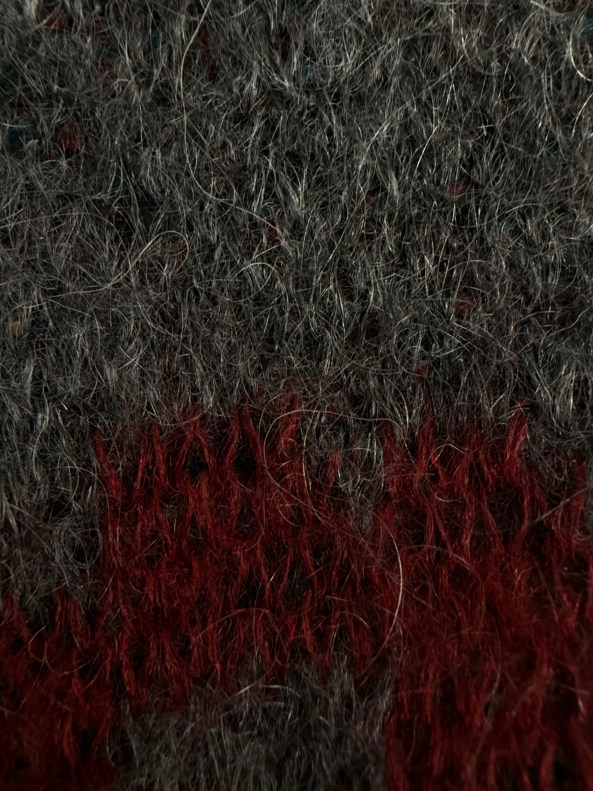 Filato soffice, leggero ma caldo, il fondo grigio melange è animato da motivi astratti nei toni del rosso e del verde, con bottoni frontali e una vestibilità naturale, morbida, facile da portare sia aperto che chiuso. Spalline rimovibili