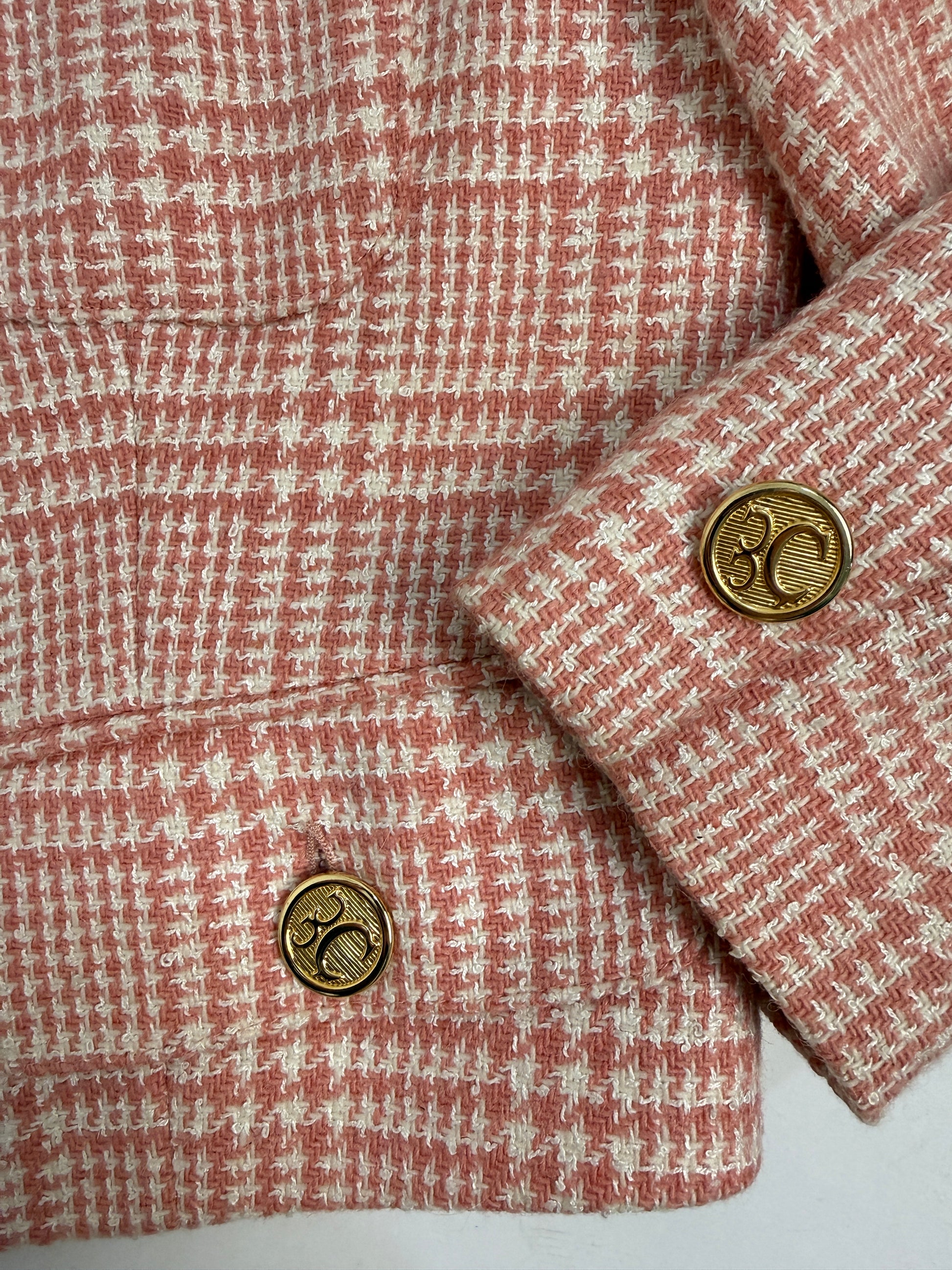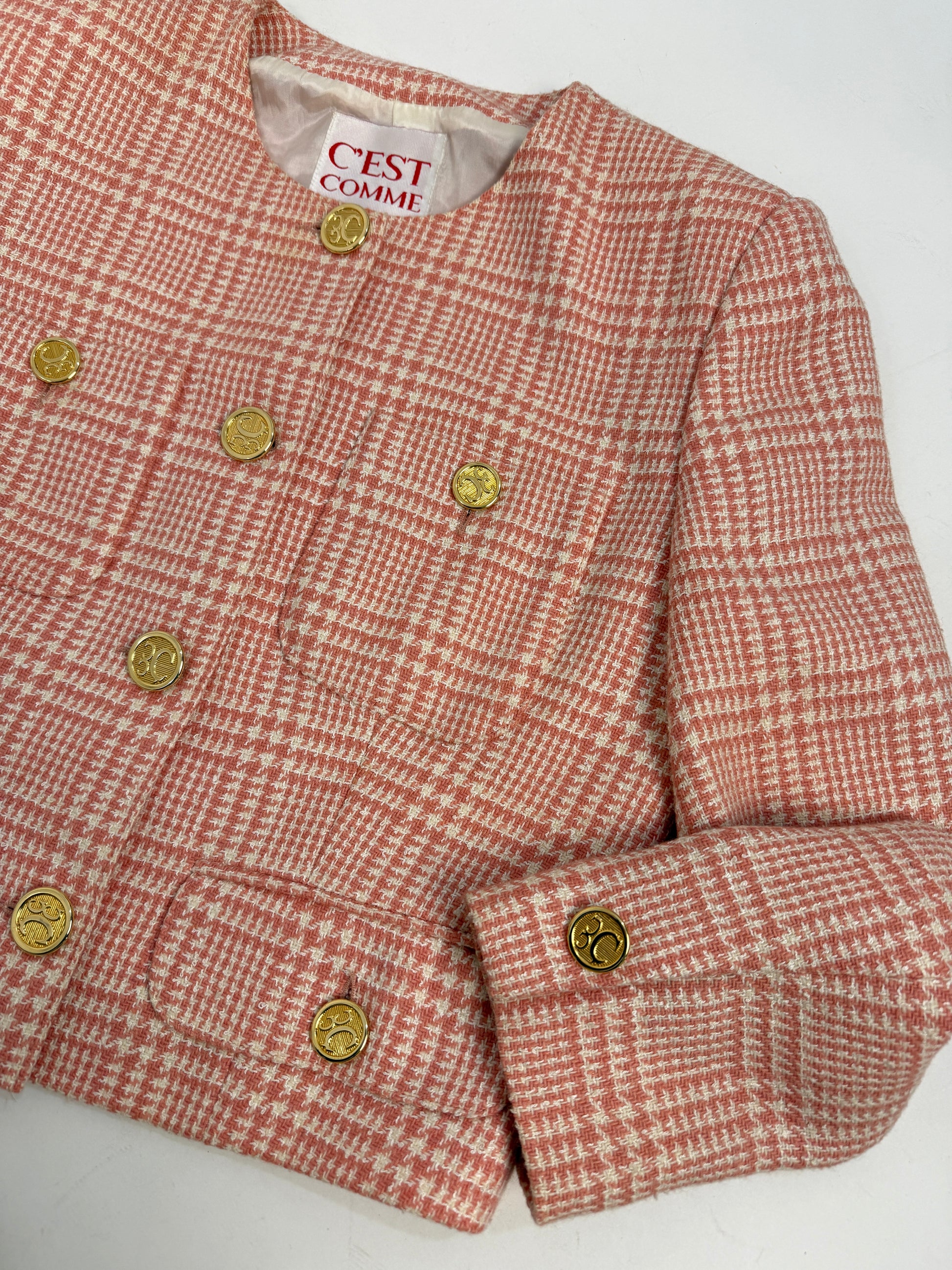 La giacca è corta, strutturata, con tasche frontali e chiusura a bottoni oro.