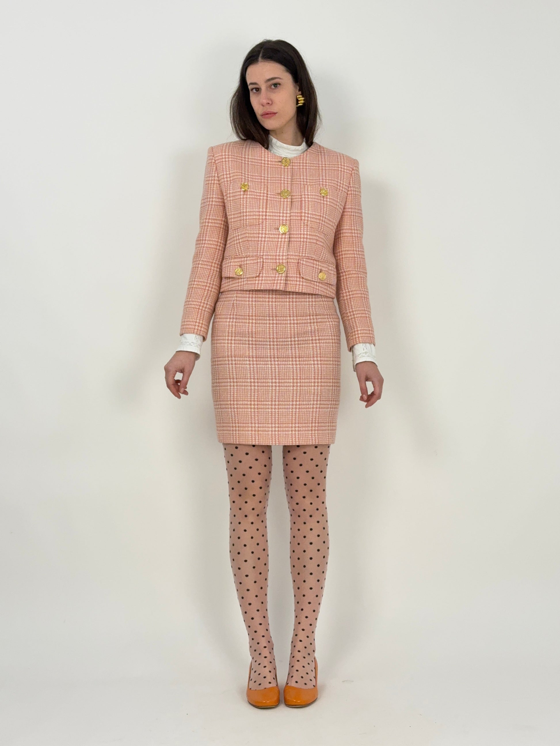 Un tailleur che richiama l’eleganza francese anni ’80: spalle ben costruite, linea pulita, vestibilità femminile. I bottoni dorati logati diventano il dettaglio protagonista, impreziosendo il capo con un tocco quasi gioiello.
