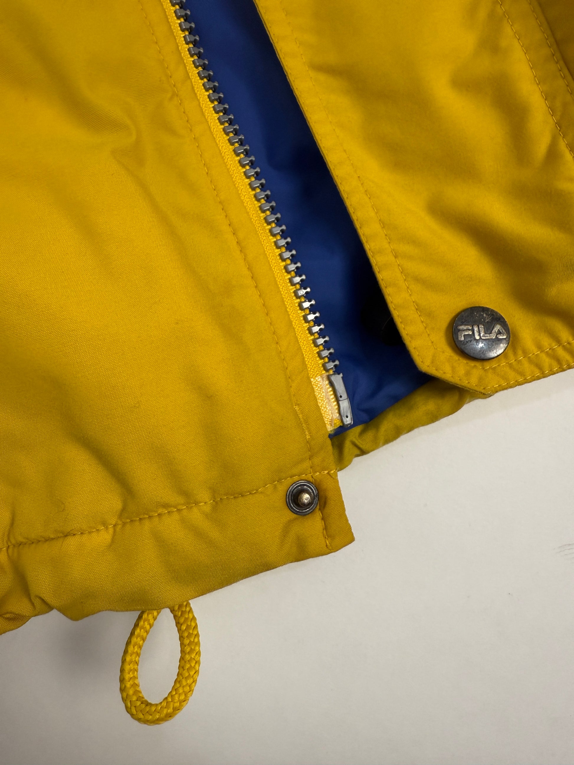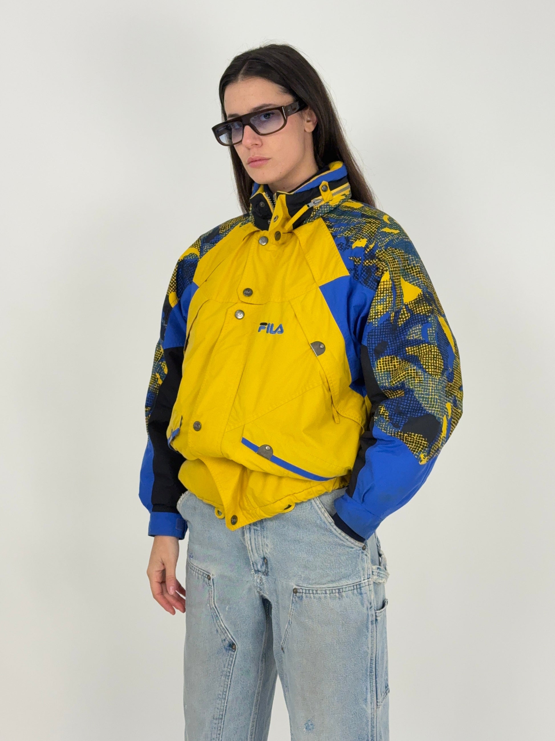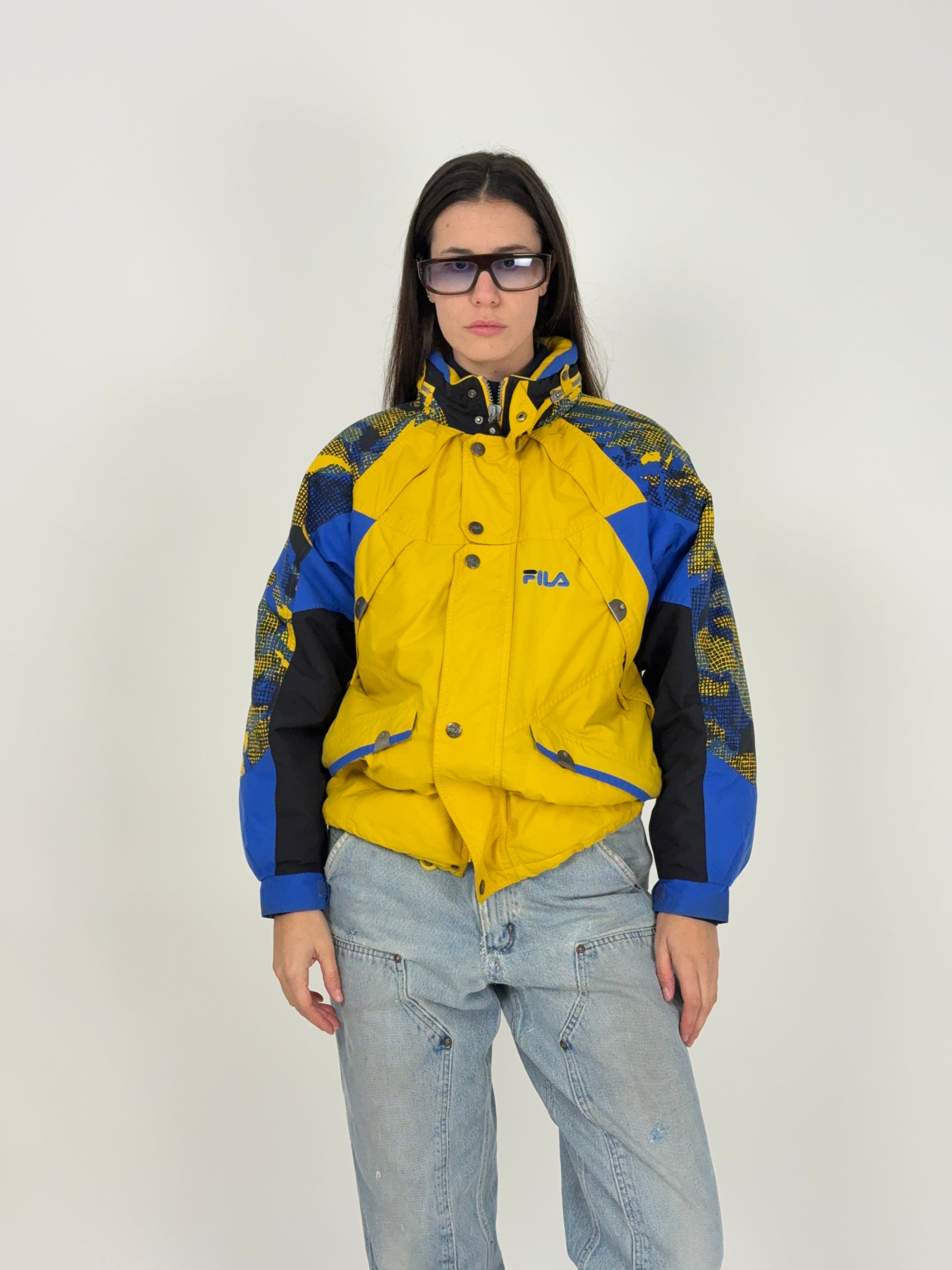 L’interno è rivestito in pile giallo caldo, mentre l’esterno alterna un audace giallo e blu navy, con stampe geometriche sulle maniche e dettagli logati Fila su zip e bottoni metallici.