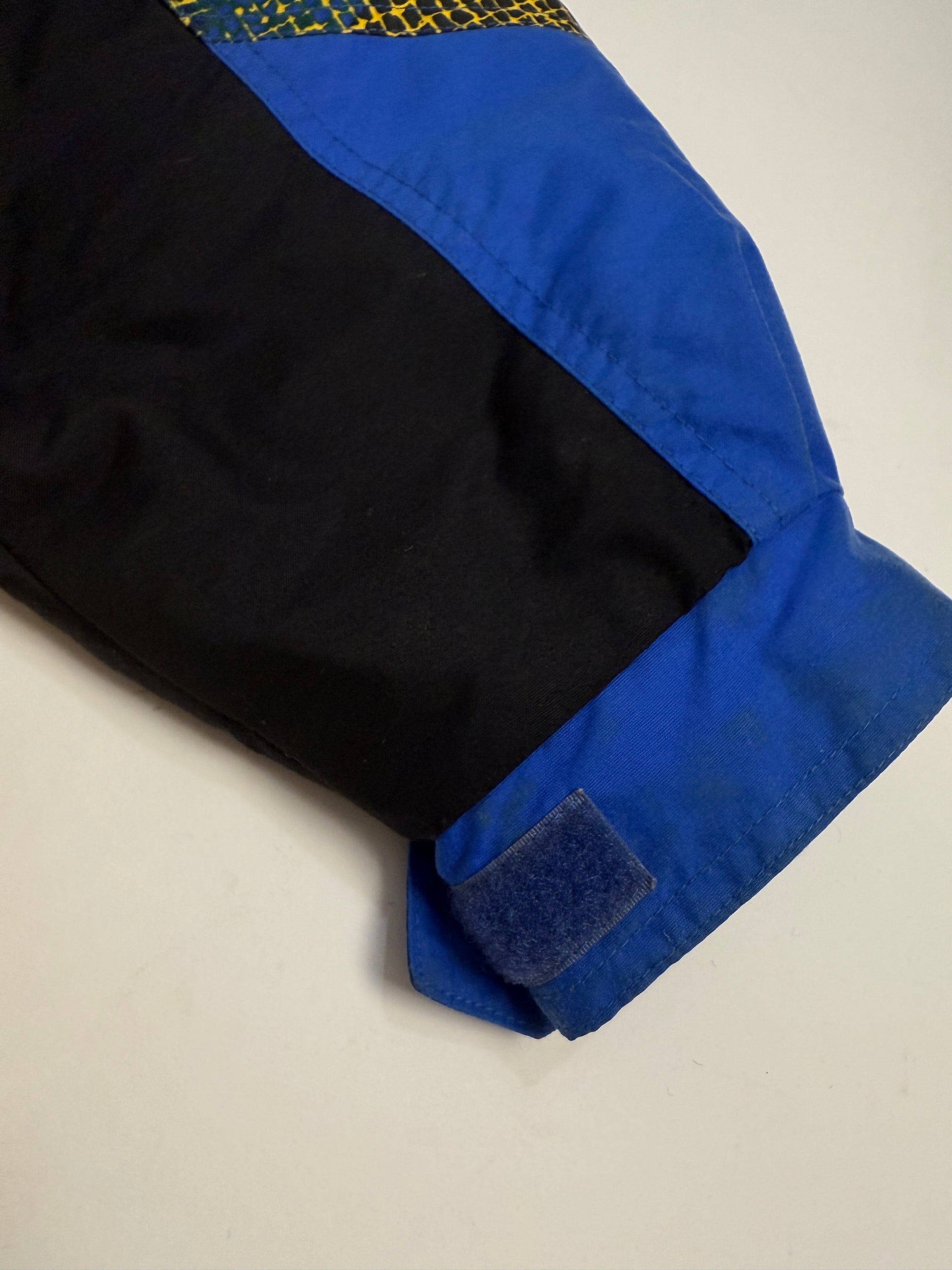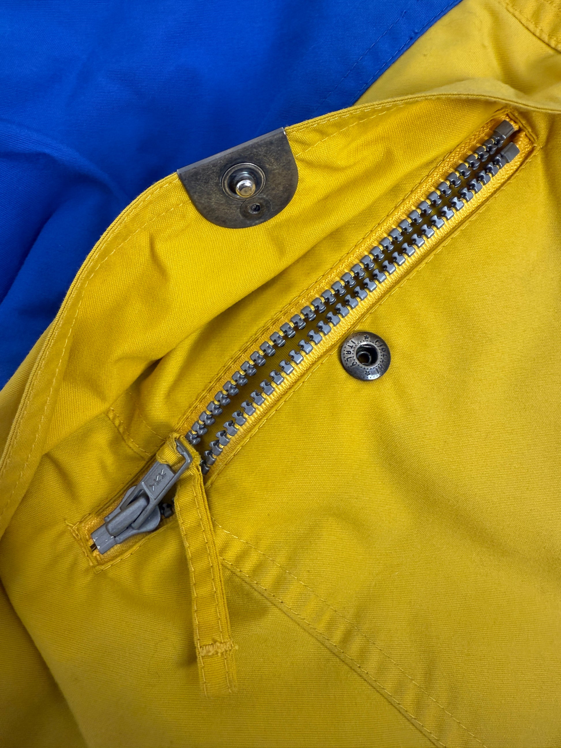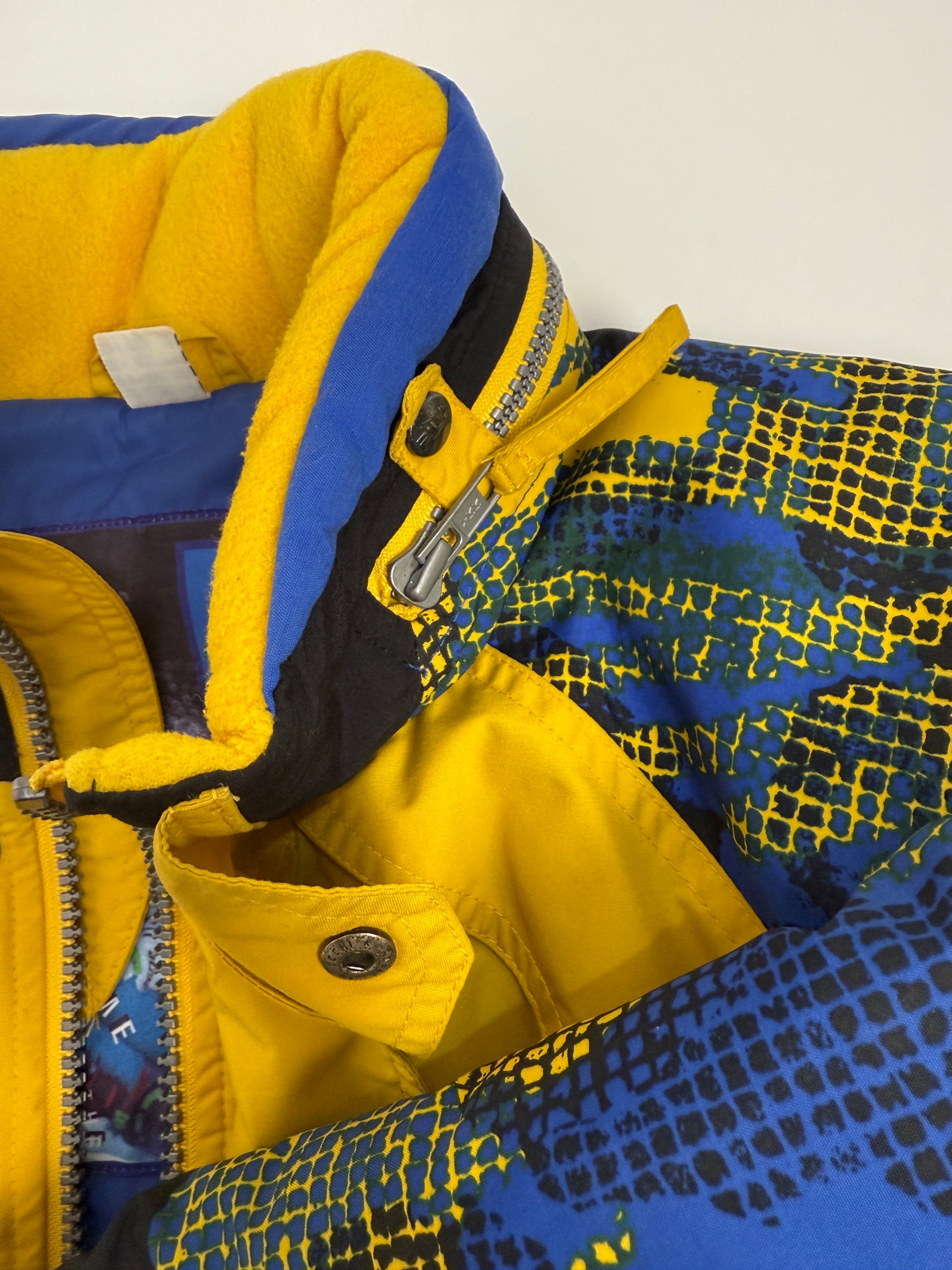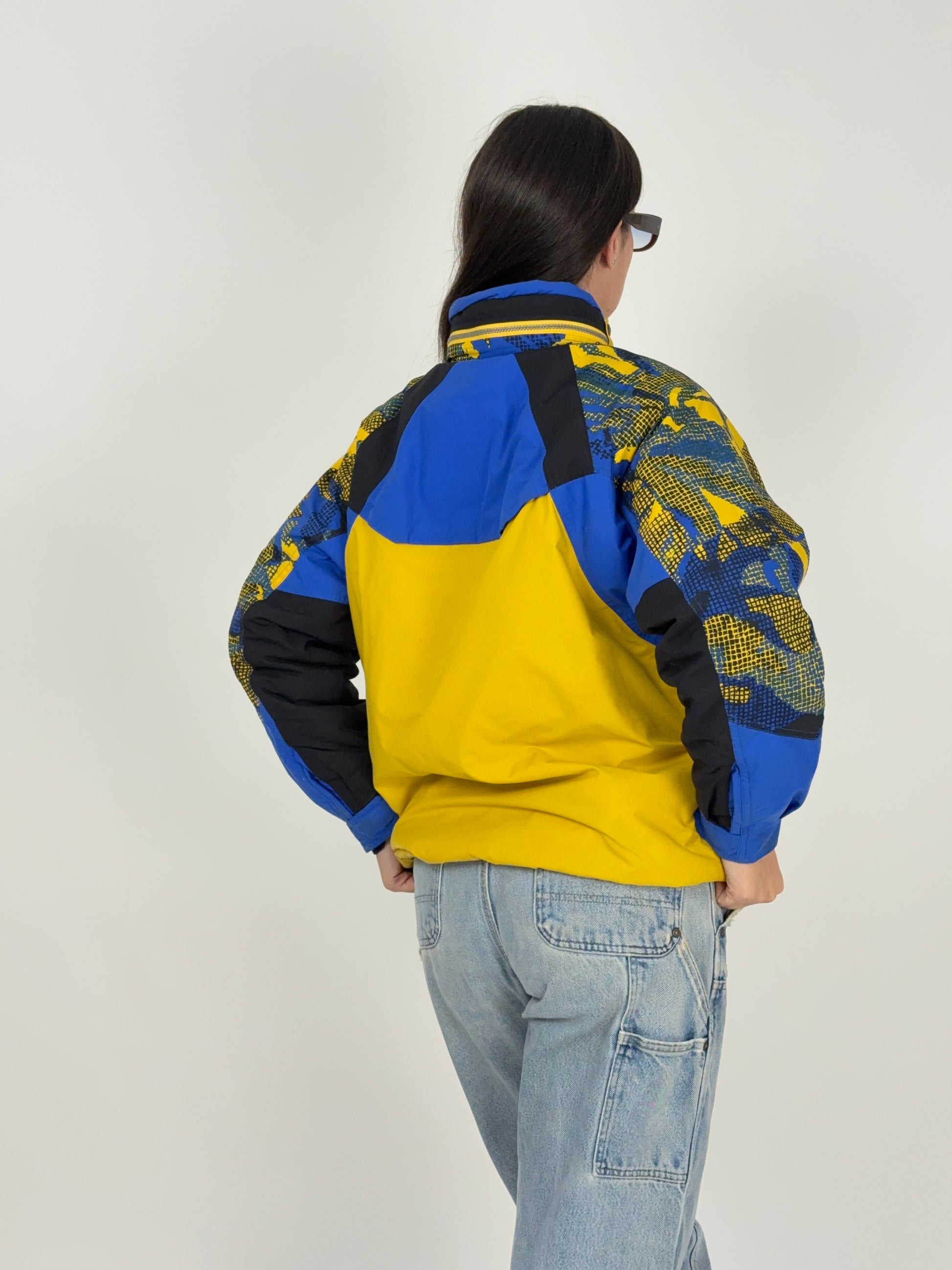 L’interno è rivestito in pile giallo caldo, mentre l’esterno alterna un audace giallo e blu navy, con stampe geometriche sulle maniche e dettagli logati Fila su zip e bottoni metallici.