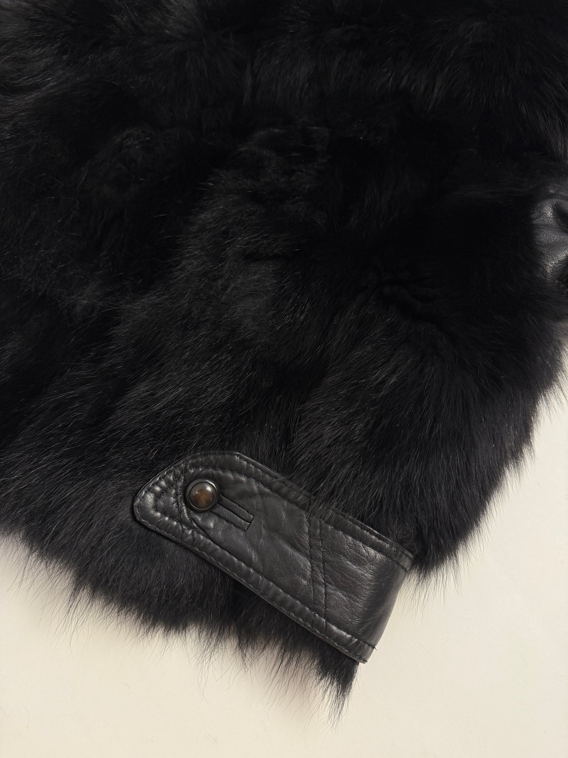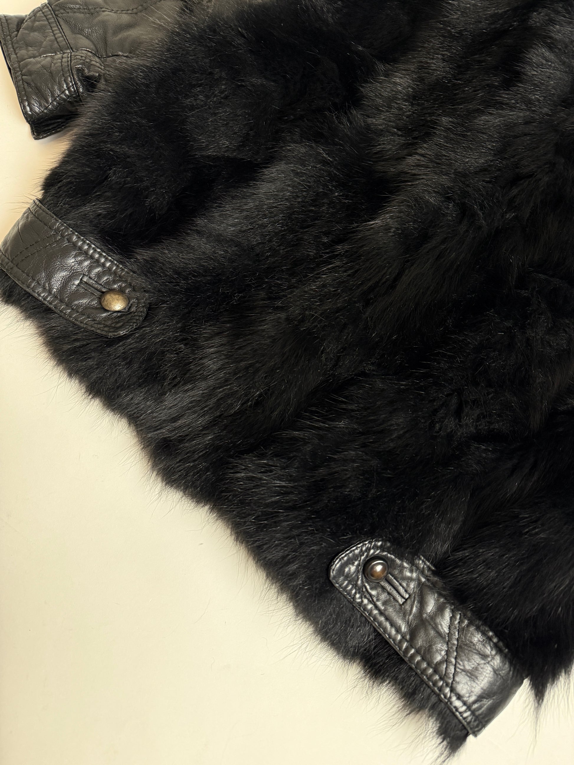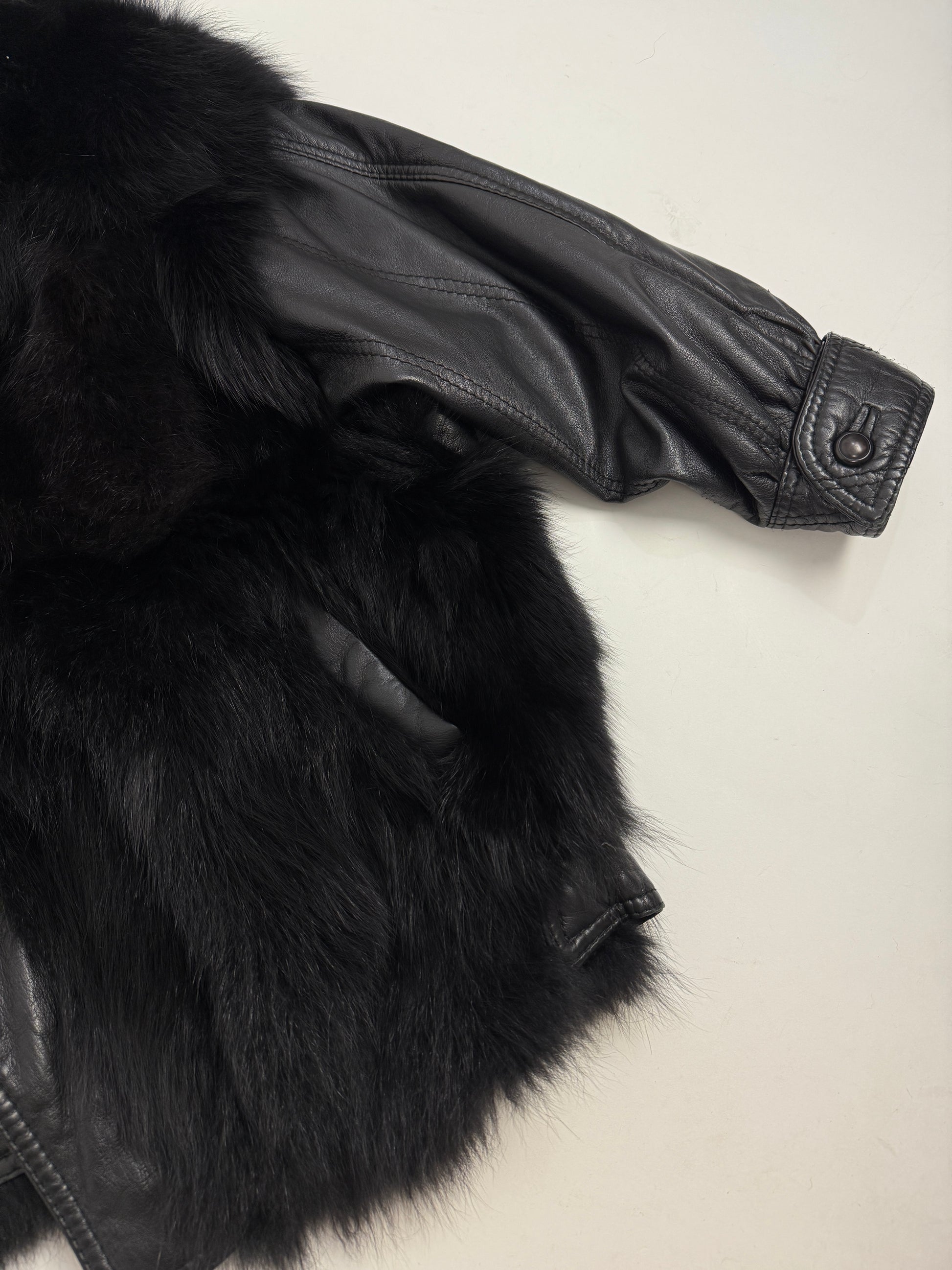 Giacca vintage donna realizzata tra la fine degli anni ’80 e i primi ’90, caratterizzata da una costruzione mista in pelle e pelliccia nera, tipica dei capispalla più audaci di quel periodo.