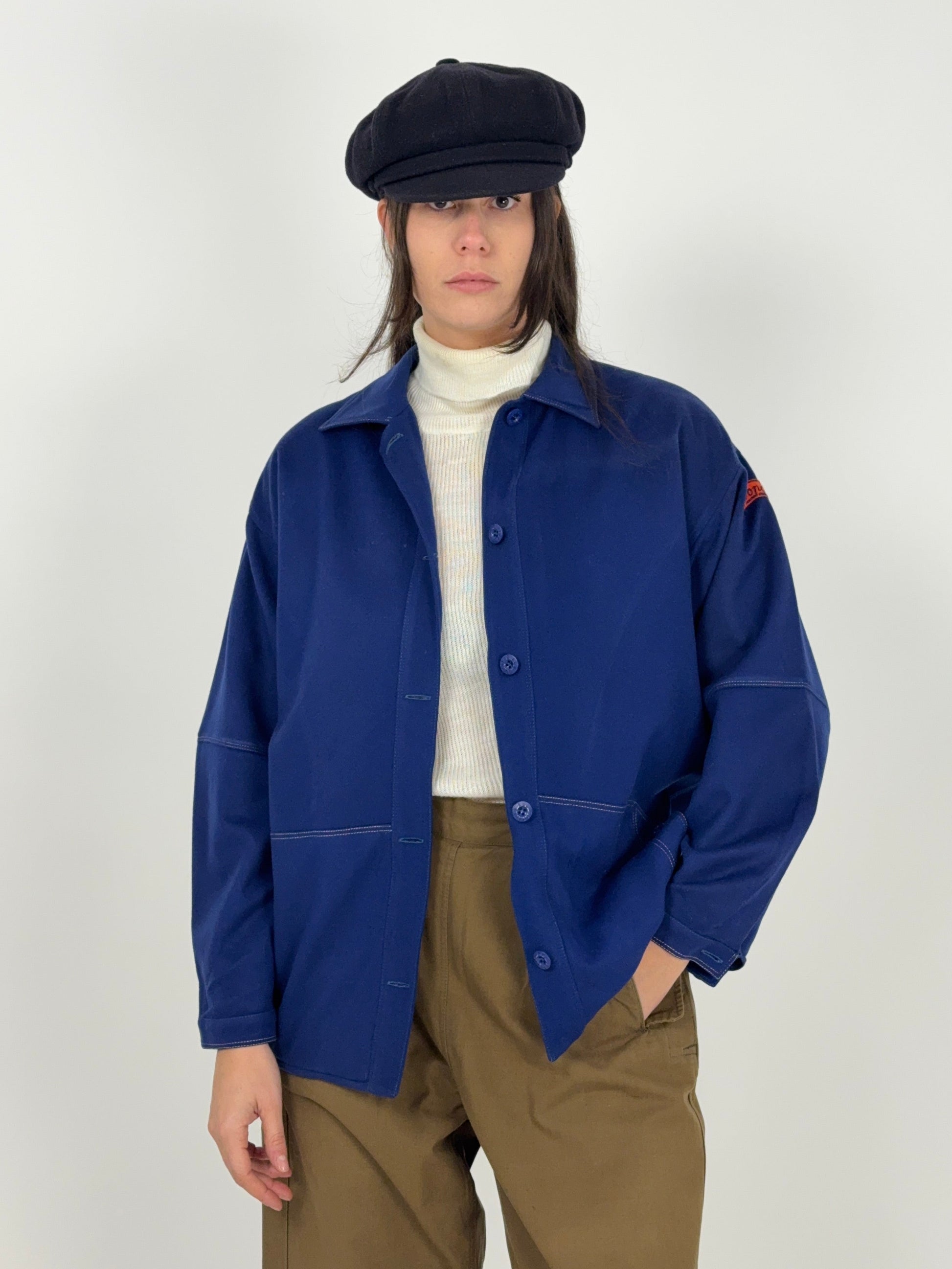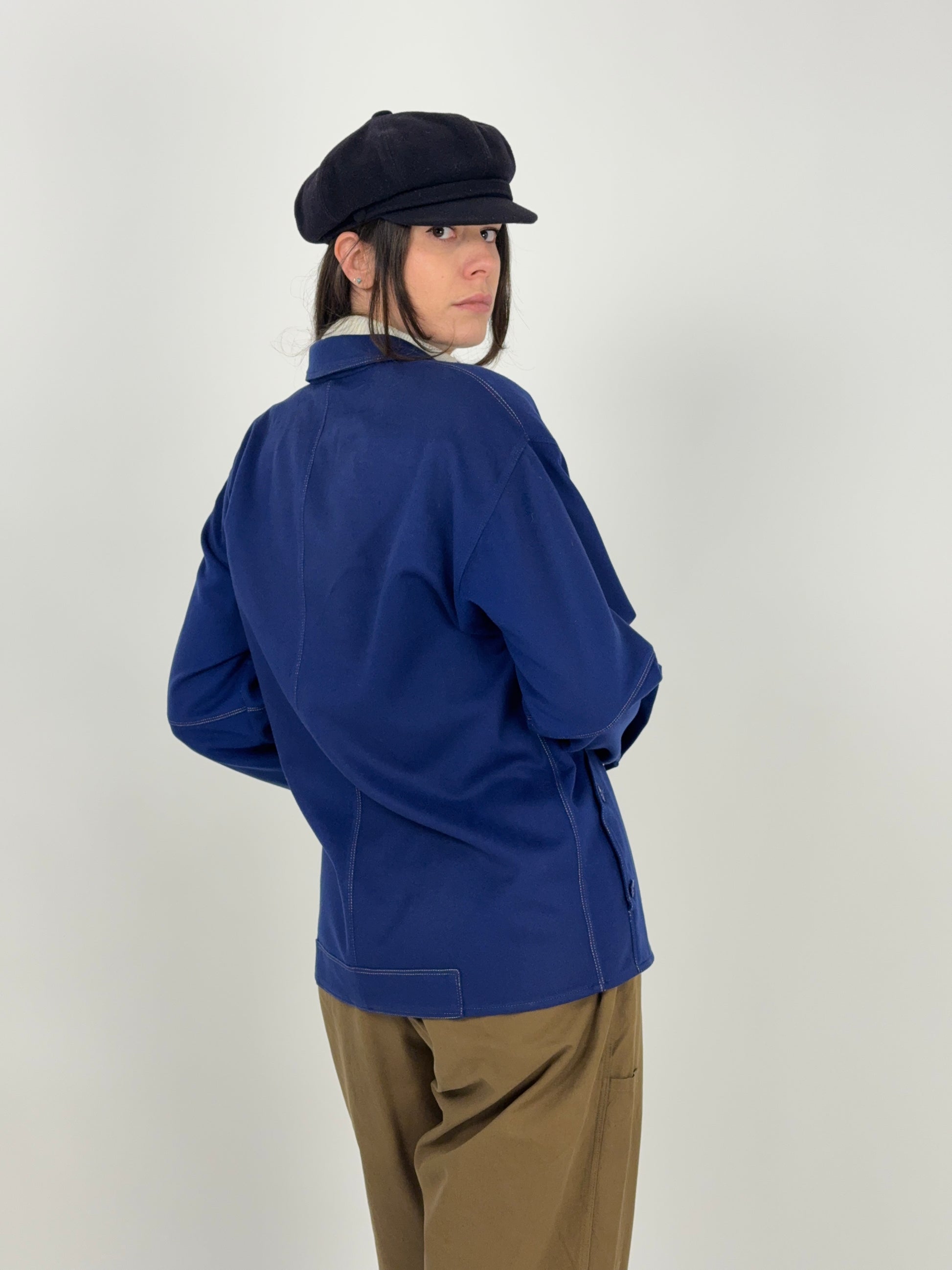 La costruzione è impeccabile: cuciture contrasto bianche, bottoni tono su tono iconici e una linea dritta che richiama le giacche da lavoro, spalline e sfoderata.