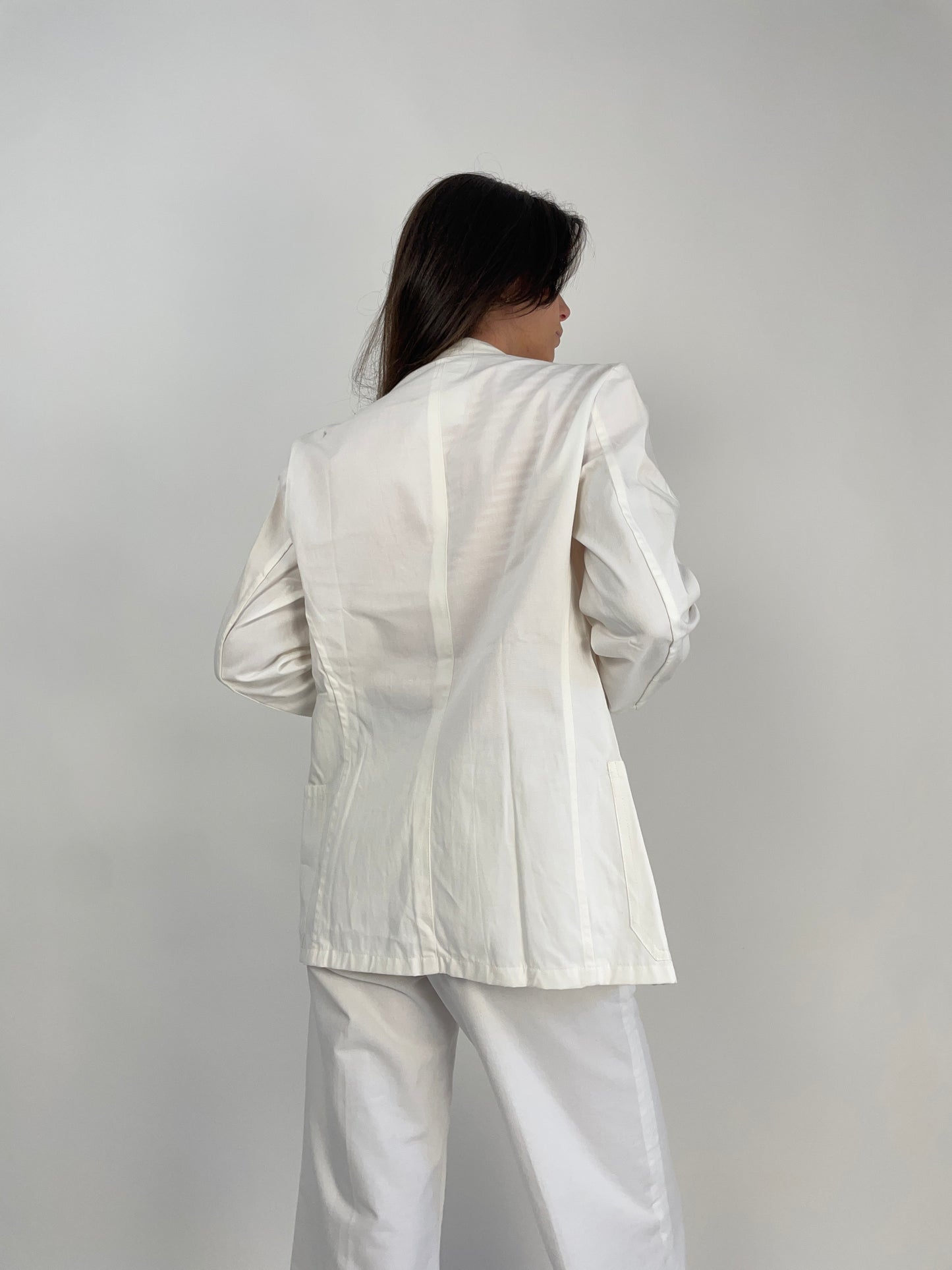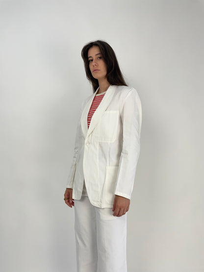 Design essenziale, realizzata in fresco cotone bianco, 1 bottone di chiusura , 3 tasche, senza fodera interna.