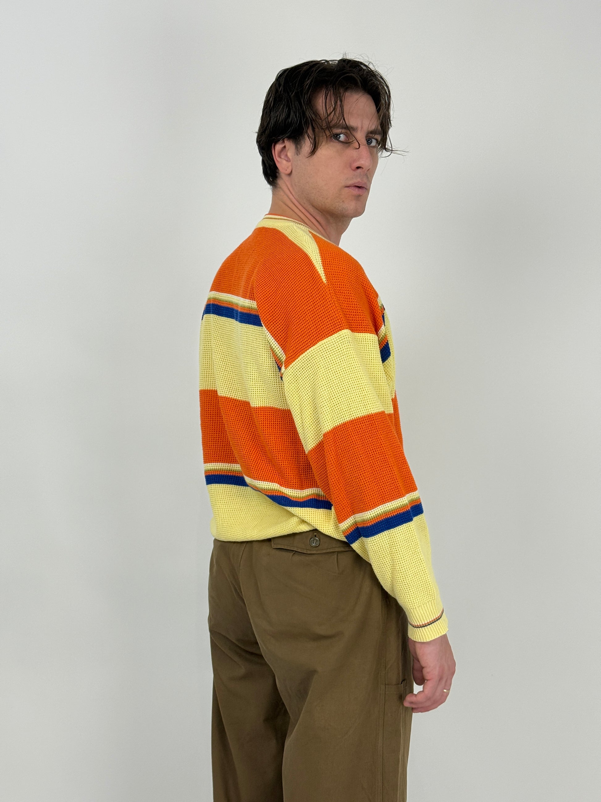 Realizzato in cotone lavorato, manica lunga, scollo a v, presenta una fantasia a righe
