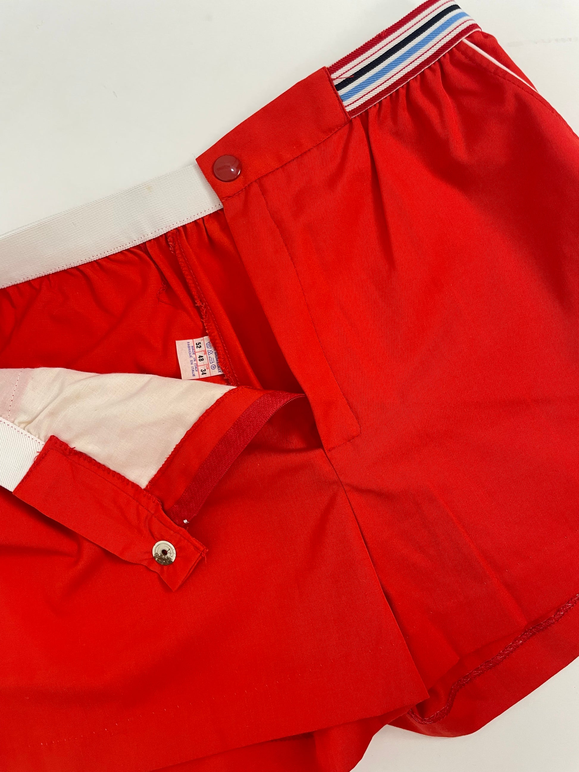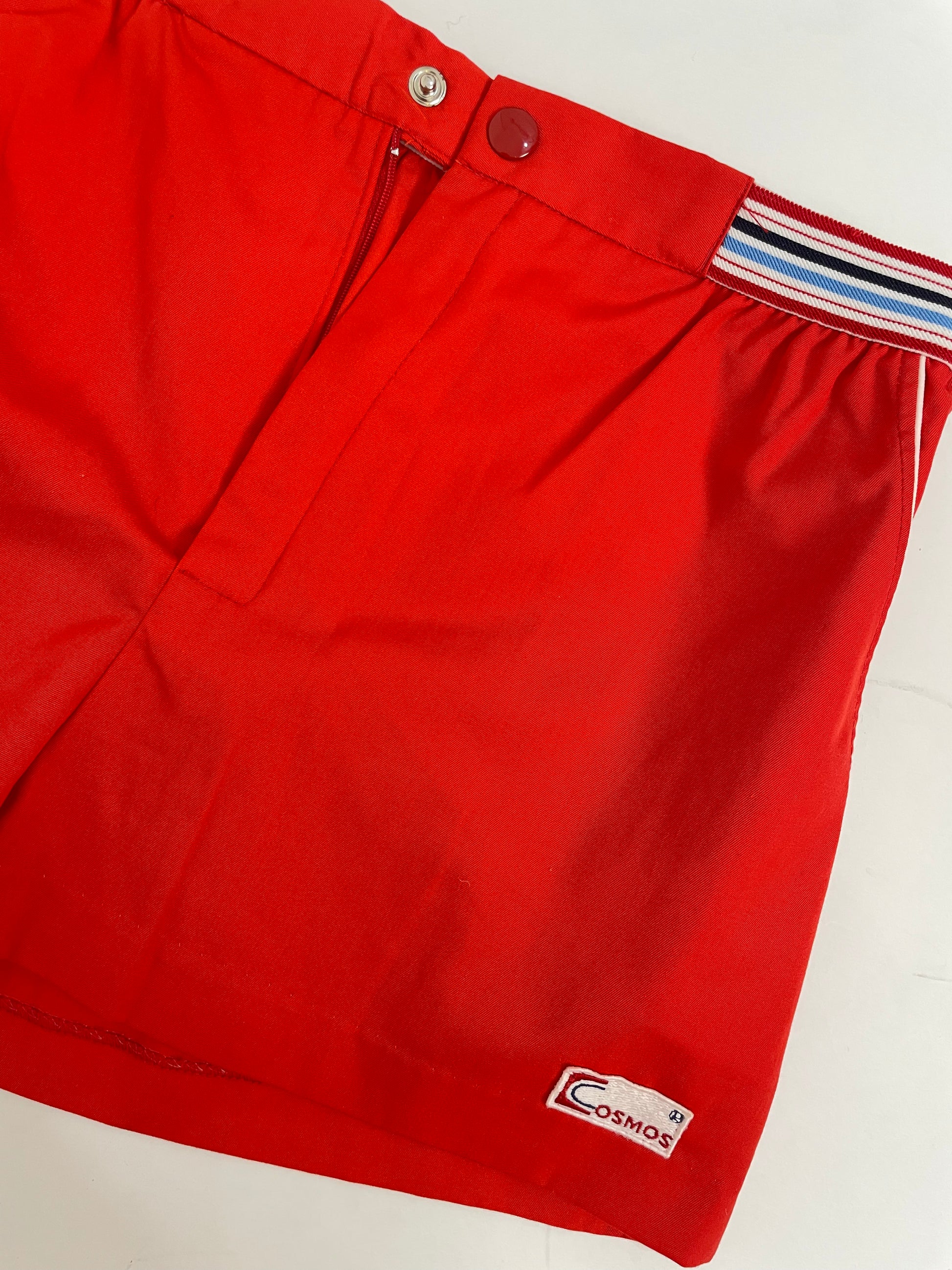 Un classico dell’activewear vintage: gli shorts Cosmos in un rosso pieno con fascia elastica a righe tricolore in vita e profili bianchi alle tasche. La linea è pulita con vita media, piccole pence che danno agio e gamba corta dritta.