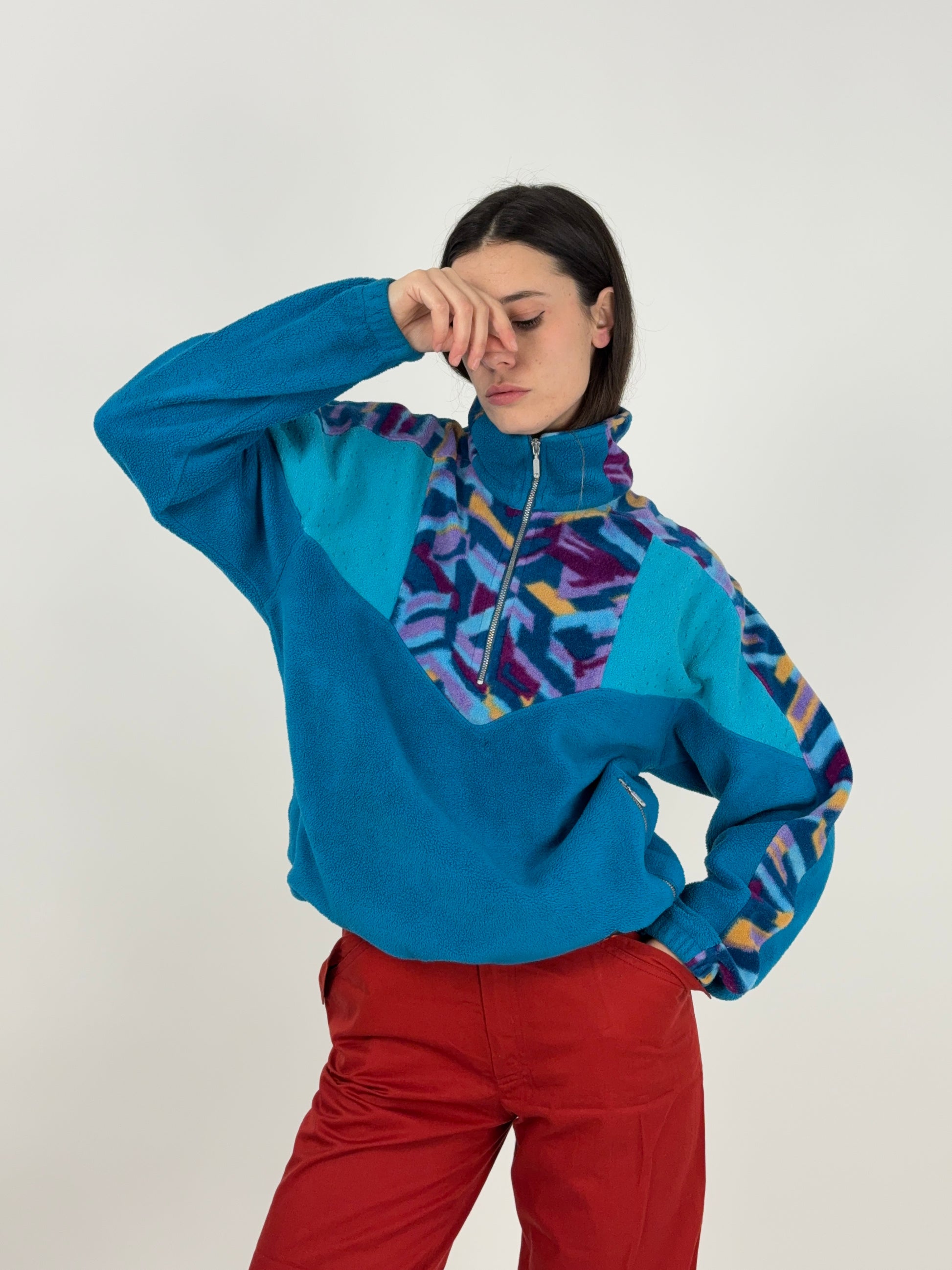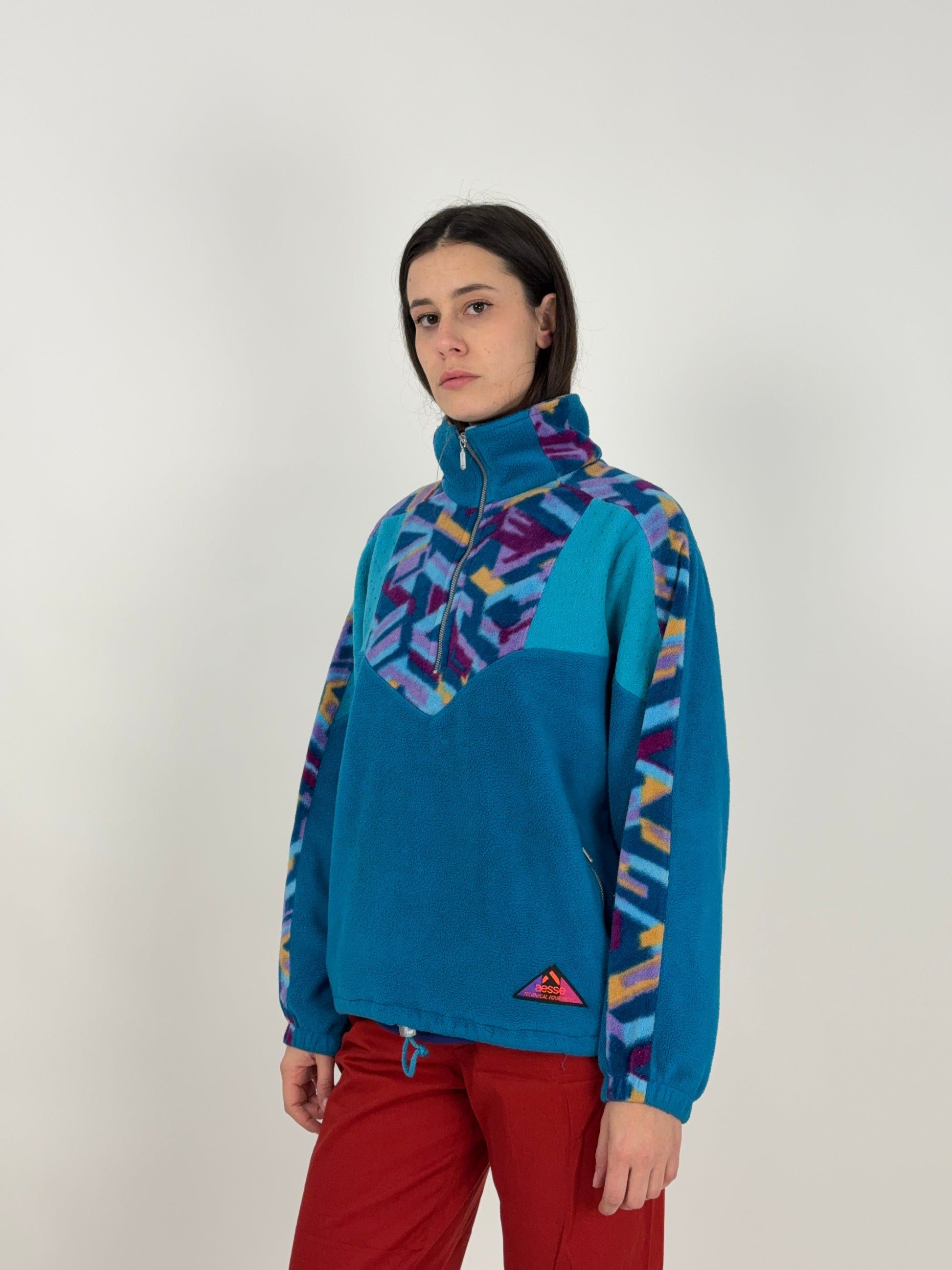 Il mix cromatico è una bomba controllata: base turchese, inserti geometrici multicolor e zip corta sul collo. I primi anni dell’outdoor tecnico quando contava la funzione prima dell’estetica