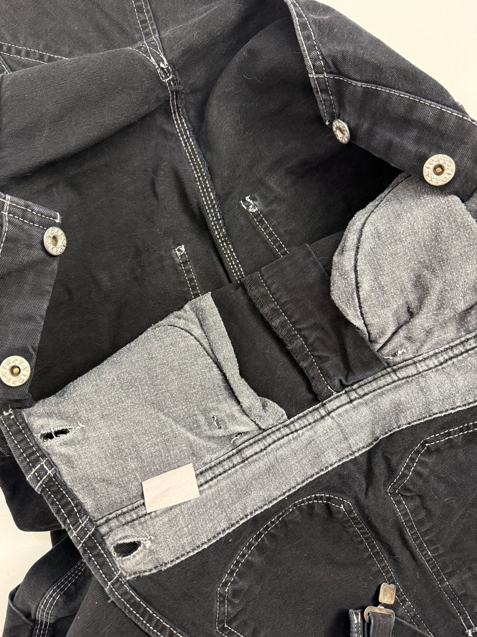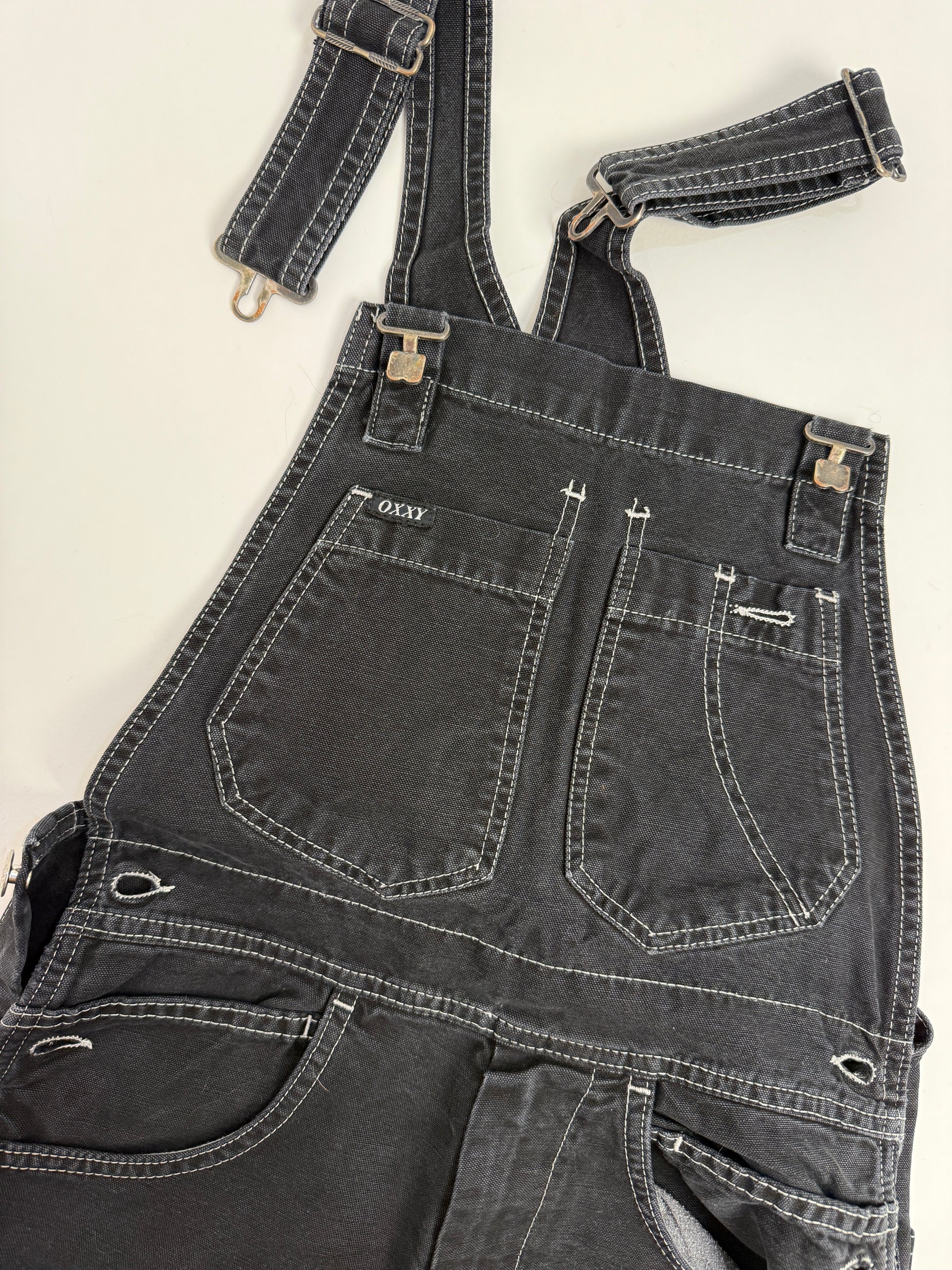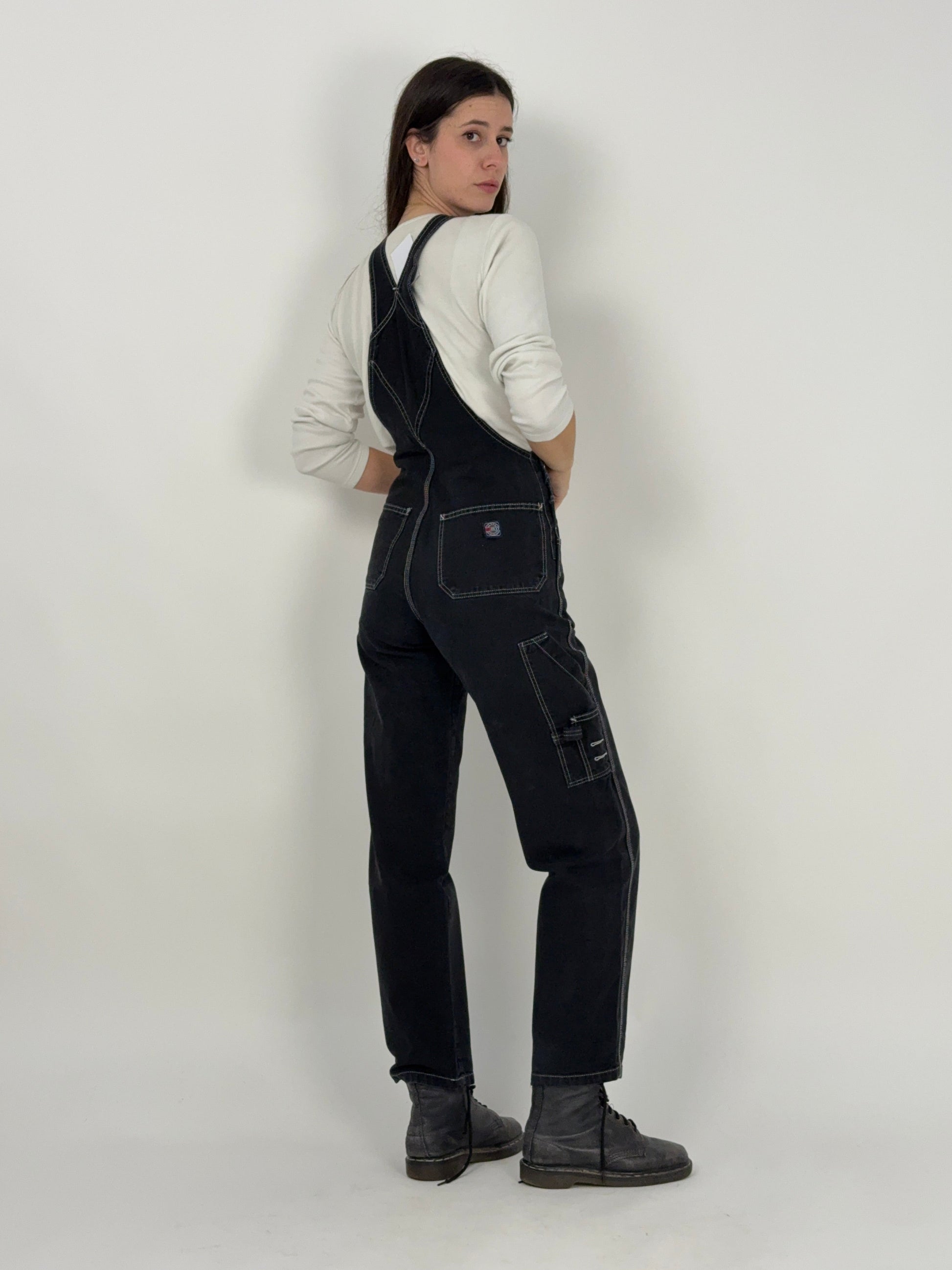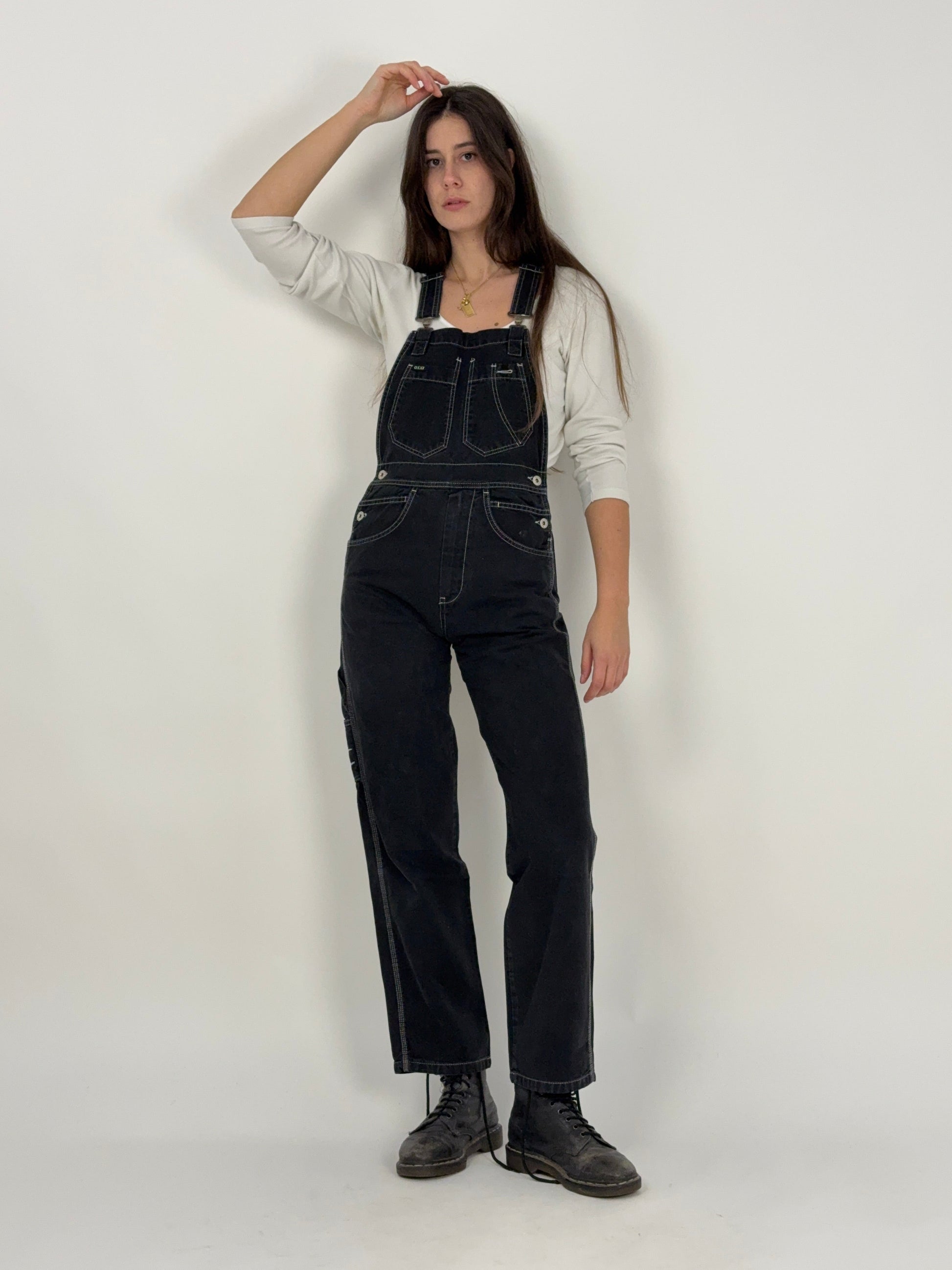 Salopette vintage OXXY in denim nero compatto, costruita con cuciture a contrasto e zip YKK in ottone, dettagli che raccontano solidità e funzione prima ancora dell’estetica. Linea pulita, vestibilità dritta, tasche multiple e struttura pensata per durare.